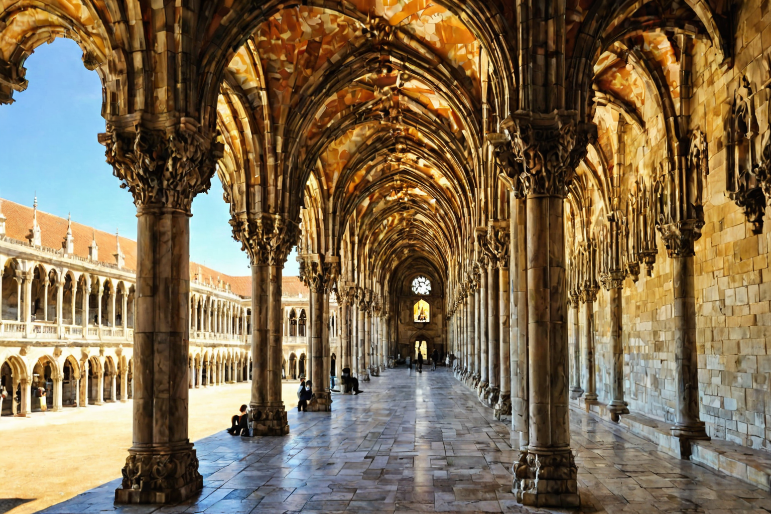 Cloisters of the Jeronimos Monastery Lisbon, Gino Severini style, Cloisters, Jeronimos Monastery, Lisbon, Manueline architecture, Portugal, golden age, intricate design, sheer scale, history, beauty, mesmerized, transported, visited HD, sharp focus, stunningly beautiful, steampunk style, antique, mechanical, brass and copper tones, gears, intricate, detailed