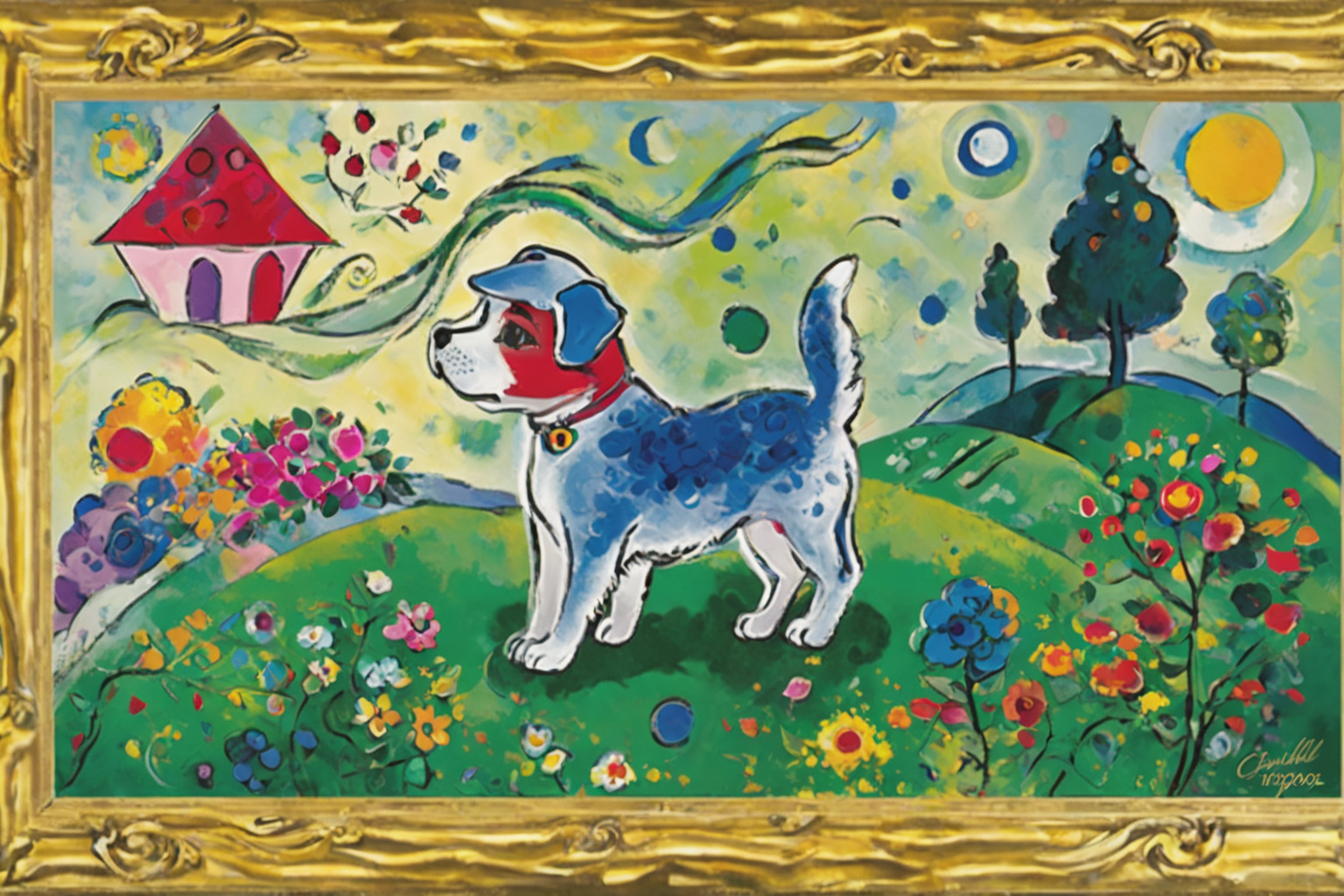 Pugapoo, Marc Chagall style, HD, sharp focus, stunningly beautiful, Color Field Painting, abstract, simple, geometic, color field painting style