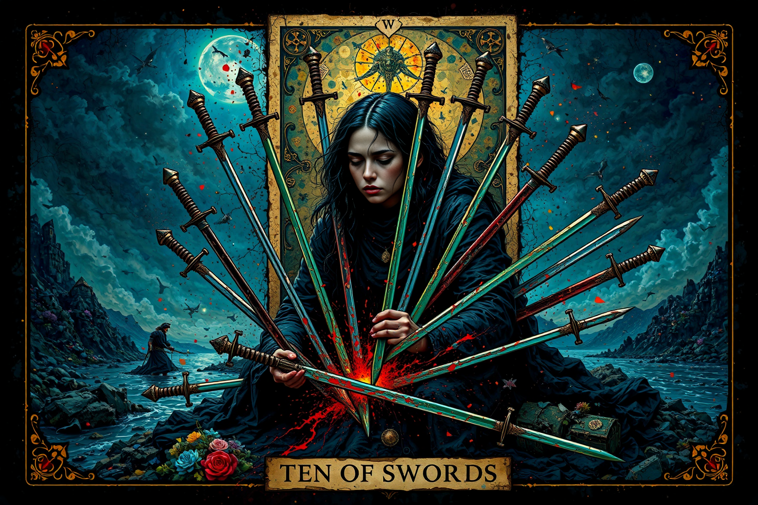 Today we have the Ten of Swords card, which signifies a great deal of emotional pain and turmoil. This card often represents feelings of despair, hopelessness, and isolation.