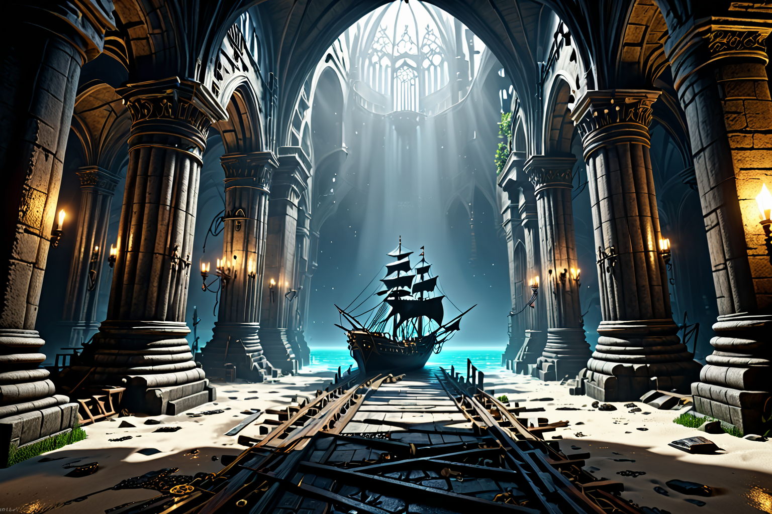 Game: Thief: The Dark Project (1998), Jackson Pollock style, Stealth game, Thief The Dark Project, medieval-inspired city, Garrett, eerie cathedrals, underground ruins, dark, Steampunk. HD, sharp focus, stunningly beautiful, nautical-themed, sea, ocean, ships, maritime, beach, marine life, highly detailed