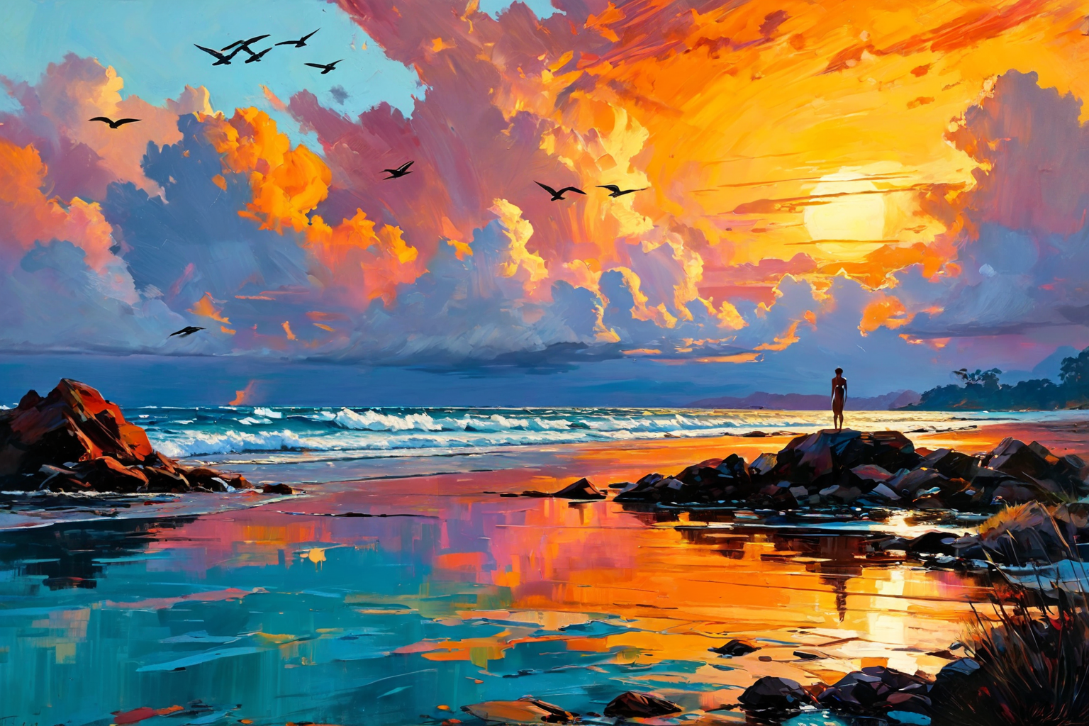 In a timeless Cambodian setting during a dramatic sunset amidst a typhoon, a majestic scene unfolds. Art Deco-inspired architecture stands stalwart as it withstands the mighty forces of nature. A lone figure in acrylic painting technique, artist Frédéric Bazille himself, observes this scene, capturing its essence through his vision and brushstrokes. As he paints the tumultuous sky and raging waters, a flock of birds soars overhead, their flight symbolizing the resilience and beauty that can be found amid chaos and transformation.