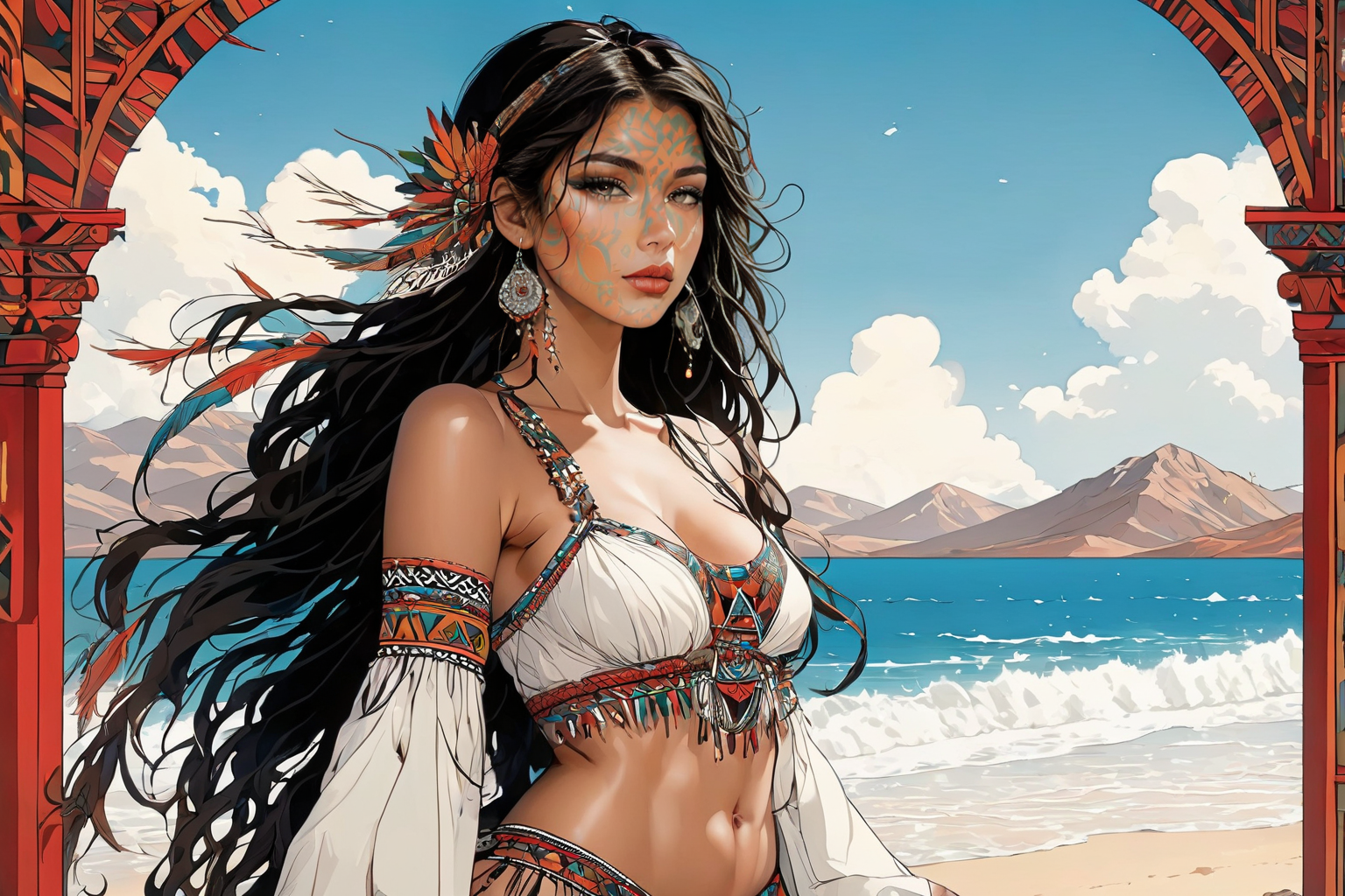 young woman, beautiful face, great body, gorgeous figure, long legs, pretty eyes, long hair, great bust, beautiful background, magnificent scenery, Aubrey Beardsley style, HD, sharp focus, stunningly beautiful, tribal style, indigenous, ethnic, traditional patterns, bold, natural colors, highly detailed