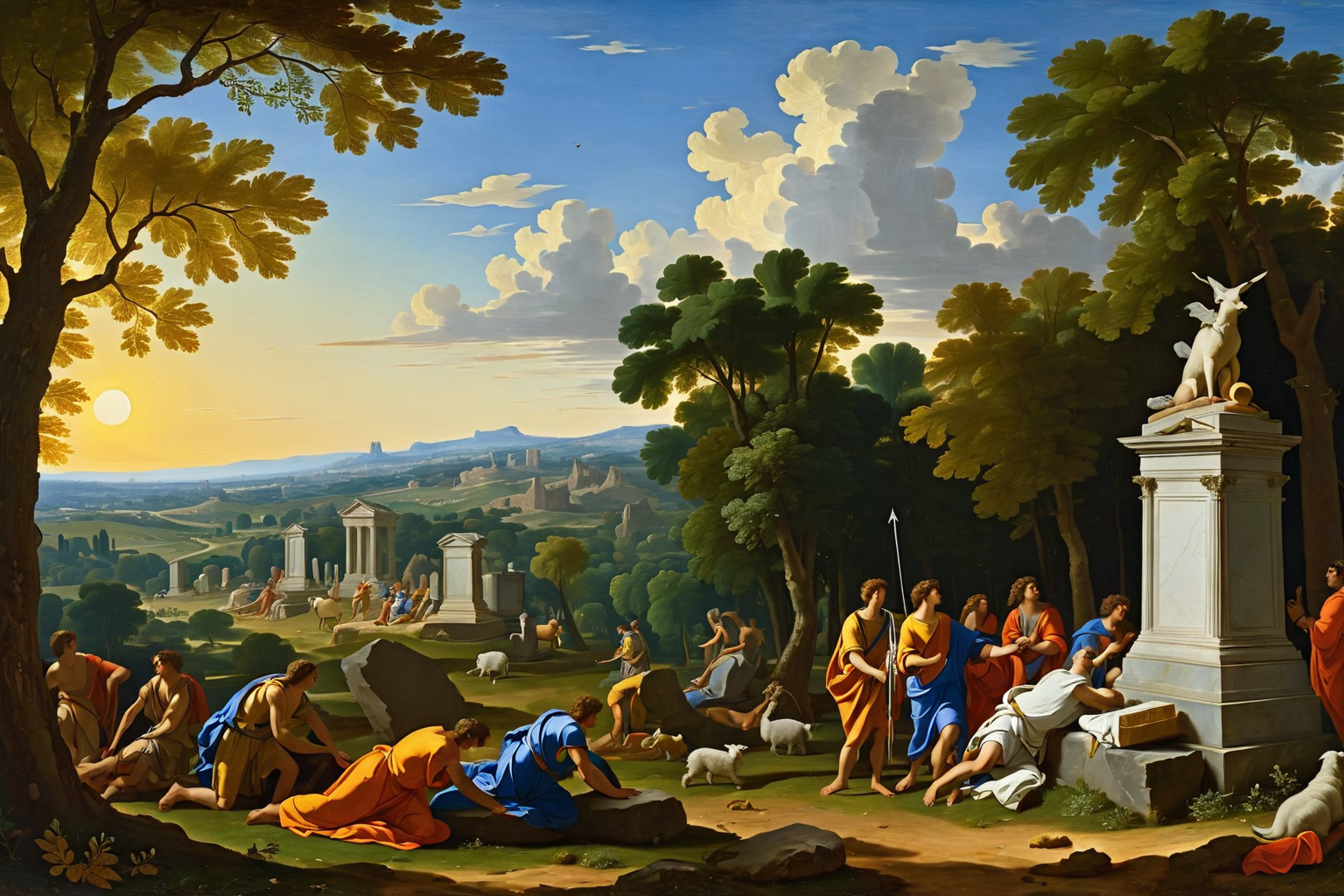 Et in Arcadia Ego by Nicolas Poussin , Nicolas Poussin, Arcadia, landscape, shepherds, tombstone, Latin phrase, And even in Arcadia, I am, death, impermanence, beauty, youth, Wallace Collection, London, England, composition, light, symbolism, influential painting, Western art history HD, sharp focus, stunningly beautiful, abstract style, non-representational, colors and shapes, expression of feelings, imaginative, highly detailed