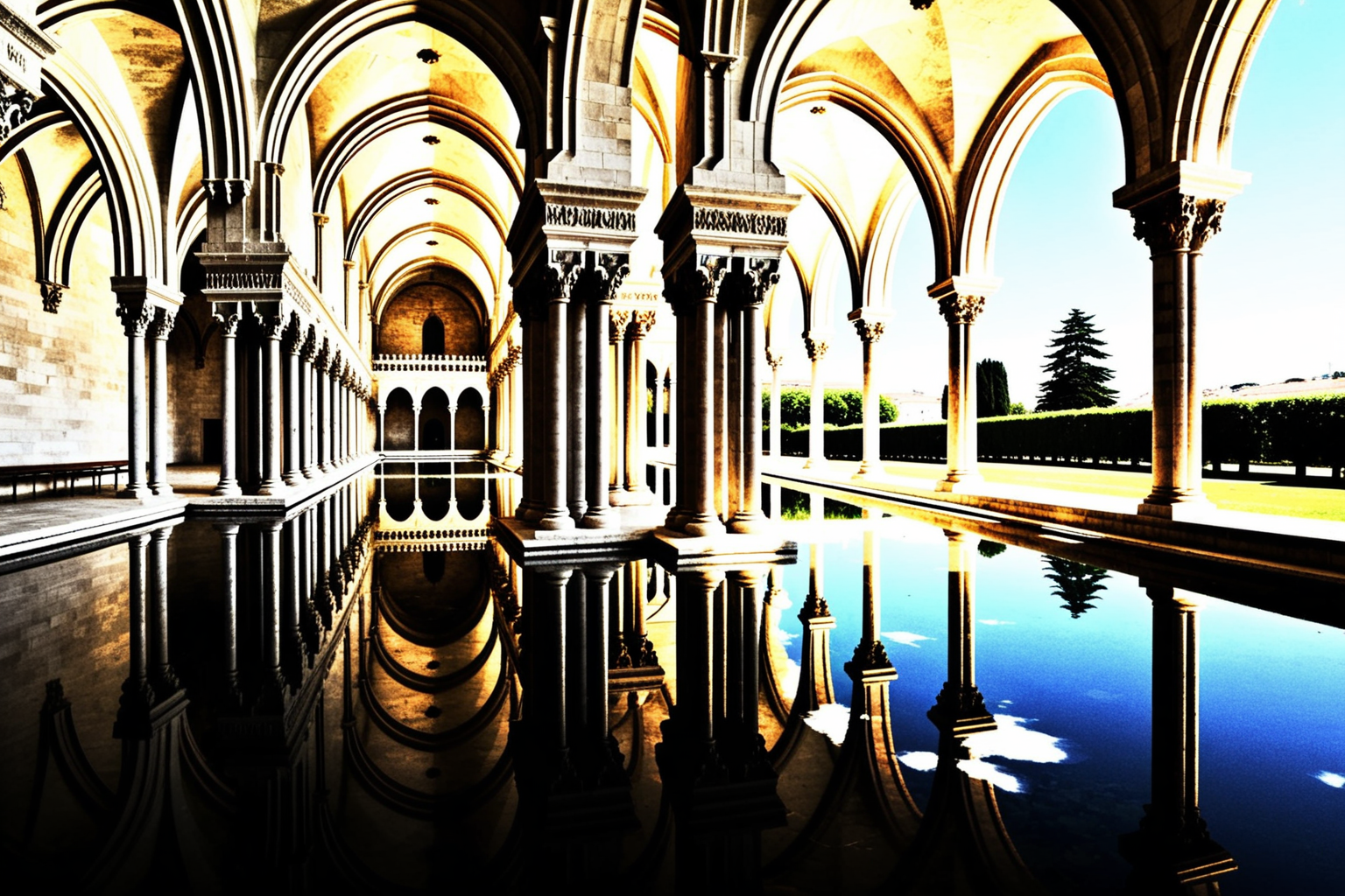 Cloisters of the Jeronimos Monastery Lisbon, Andreas Mantegna style, Manueline architecture, stone carvings, serene cloister gardens, historical reverence, Lisbon, intricate design, tranquil ambiance, profound sense, harmonious blend, Jeronimos Monastery, captivating experience. HD, sharp focus, stunningly beautiful, Terragen, beautiful massive landscape, epic scenery, Terragen
