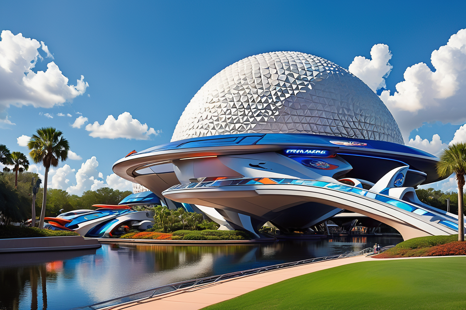 Epcot Florida, Franz Marc style, futuristic architecture, innovative displays, rides, Test Track, Mission Space, learning, different countries, cultures, World Showcase, exhilarating experience, magic, day, excitement, discovery. HD, sharp focus, stunningly beautiful, comic, graphic illustration, comic art, graphic novel art, vibrant, highly detailed