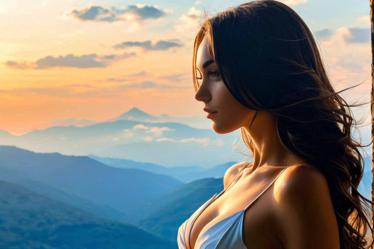 young woman, beautiful face, great body, gorgeous figure, long legs, pretty eyes, long hair, great bust, beautiful background, magnificent scenery, Aidan Salakhova style, HD, sharp focus, stunningly beautiful, flat papercut style, silhouette, clean cuts, paper, sharp edges, minimalist, color block