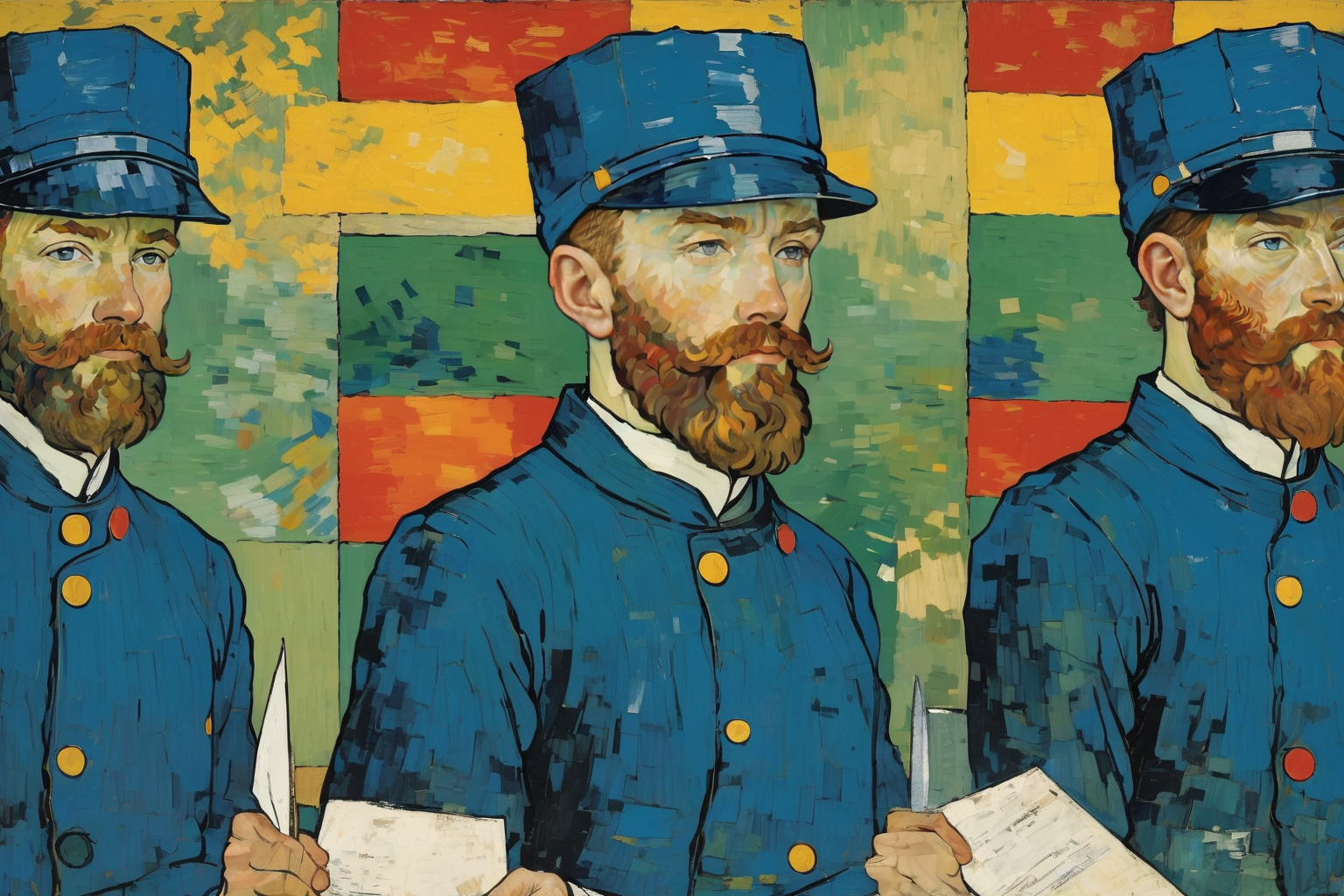 Portrait of the Postman Joseph Roulin by Vincent van Gogh , Postman, Joseph Roulin, Vincent van Gogh, Saint-Paul-de-Mausole asylum, Saint-Rémy, France, brushwork, color, emotional depth, pivotal period, mental state. HD, sharp focus, stunningly beautiful, Suprematism, abstract, limited color palette, geometric forms, Suprematism