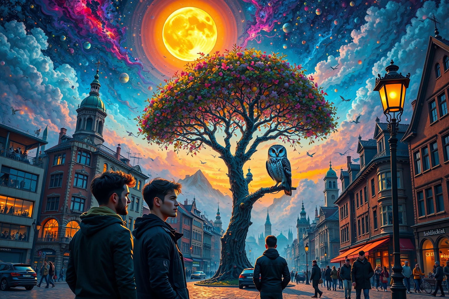 Sylvester Shchedrin style, Futuristic Germany, vibrant night scene, celestial source, sunny glow, cityscape, modern architecture, traditional German buildings, contrasted silhouettes, radiant sky, young men, Katsura tree, bioluminescence, ethereal glow, Sylvester Shchedrin, mural, bold lines, vivid colors, nocturnal animal, luminous owl, old-world streetlamp HD, sharp focus, stunningly beautiful, alien-themed, extraterrestrial, cosmic, otherworldly, mysterious, sci-fi, highly detailed