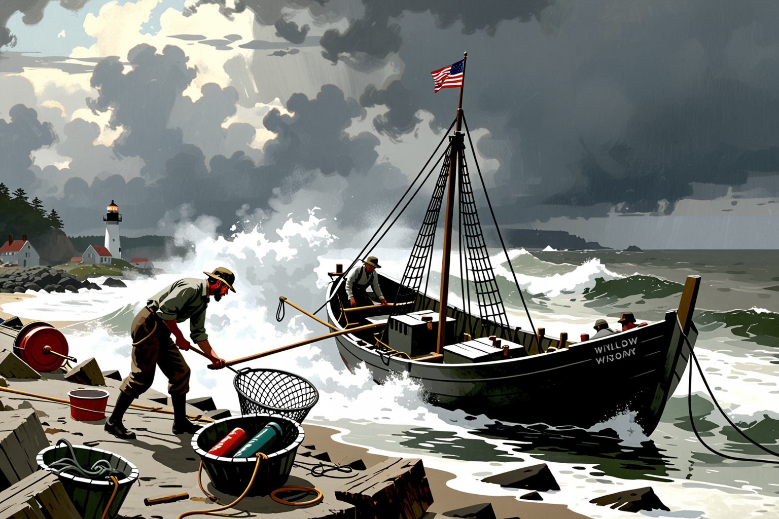 NSFW, The Fog Warning by Winslow Homer , Winslow Homer, oil on canvas, fisherman, storm, preparation, nets, hauling, New England coastline, atmosphere, power, nature, human labor, vivid depiction. HD, sharp focus, stunningly beautiful, Sketchup, CAD, professional design, Sketchup