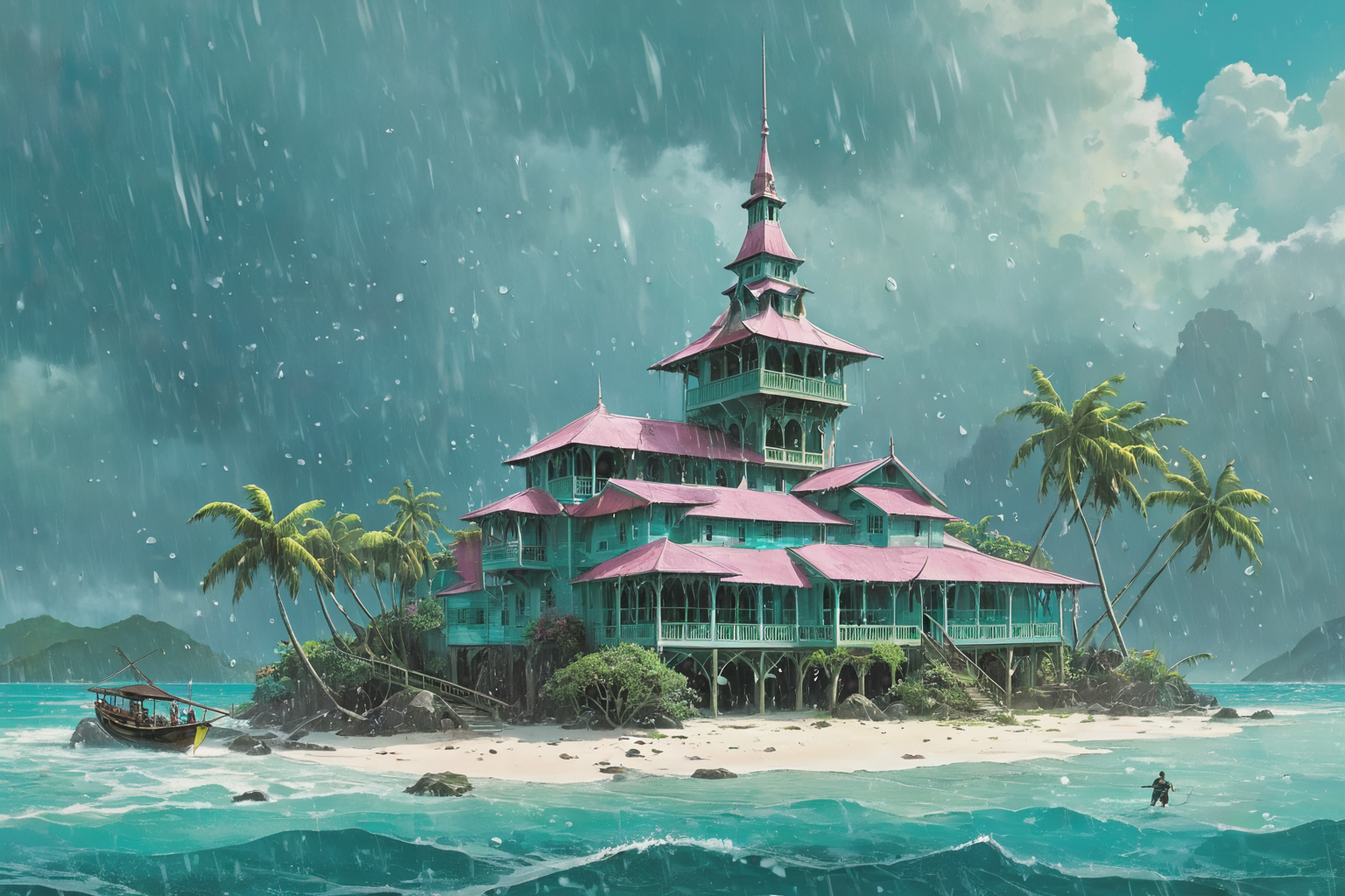 Sylvester Shchedrin style, Saint Vincent and the Grenadines, far future, day, weather, torrential hail storm, pastel-colored buildings, shimmering, icy glaze, lone, colossal Desert Rose, iridescent quartz, bioluminescent moss, petals, unfurling, relentless hail, architecture, bizarre blend, colonial Caribbean villas, sleek, organic structures, turquoise sea, people, animals, rose, flooded buildings, Sylvester Shchedrin, Sentimentalism, scroll painting technique, intricate, melancholic details, texture, evocative color, blues, greens, shimmering pinks, poignant beauty, isolation HD, sharp focus, stunningly beautiful, fighting game style, dynamic, vibrant, action-packed, detailed character design, reminiscent of fighting video games