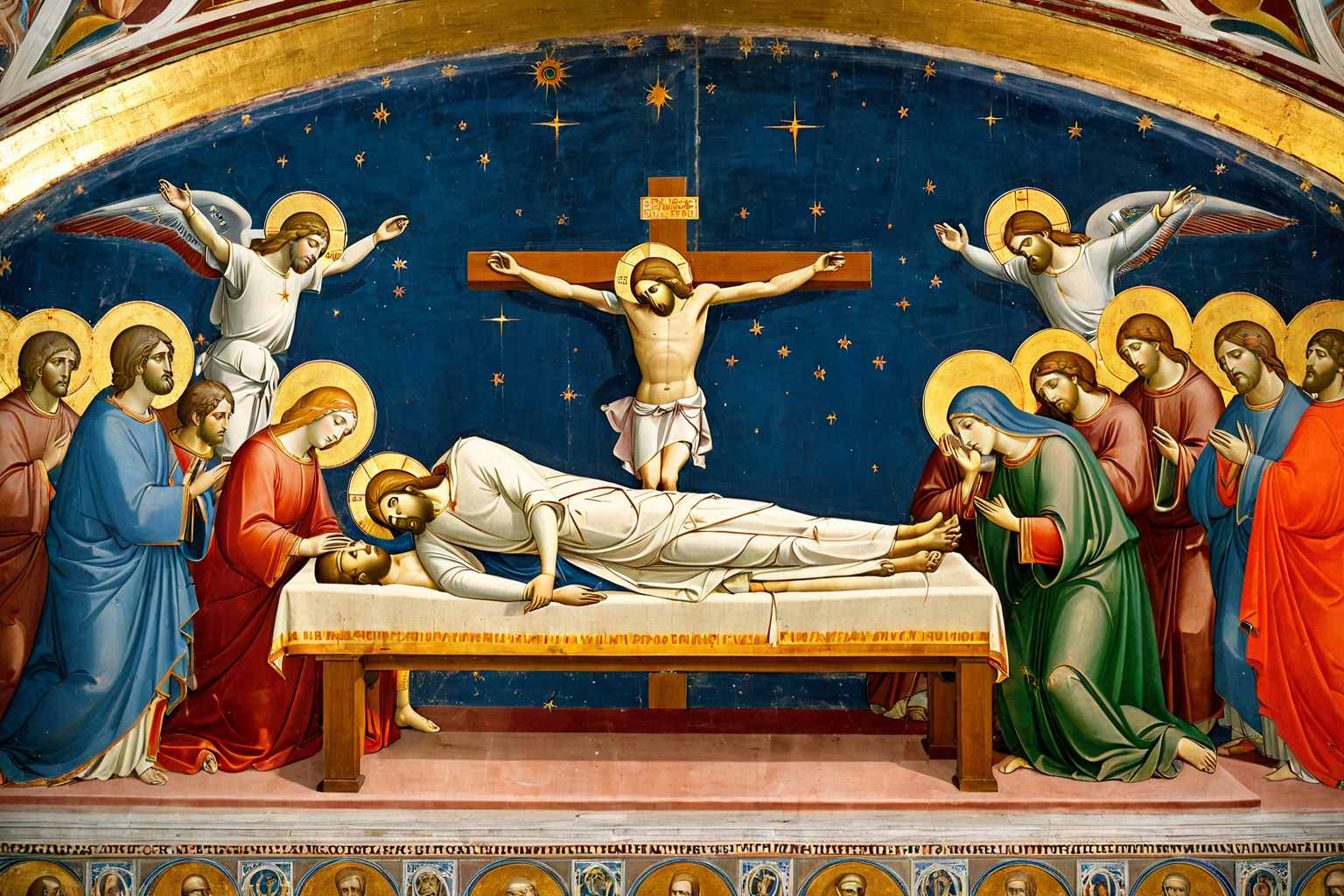 Lamentation of Christ by Giotto , Giotto, Lamentation of Christ, fresco, Scrovegni Chapel, Padua, Italy, around 1305, famous, masterpiece, Italian Renaissance art, Jesus, mourned, followers, crucifixion, color, composition, emotional intensity HD, sharp focus, stunningly beautiful, Astral Aura, astral, colorful aura, vibrant energy