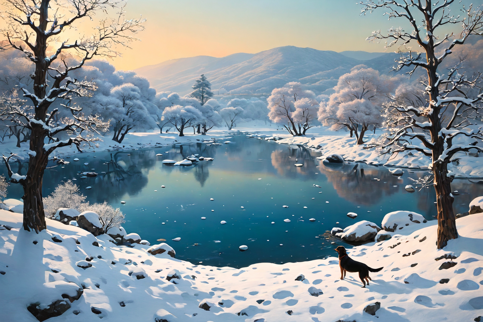 The picture takes place in Greece at dawn in the far future. The weather is thundersnow. In the background, vast snowy landscapes stretch with Sophora trees standing tall, their branches adorned with heavy snowflakes. A calm river flows through the scene, reflecting the snowy sky. In the foreground, a lone shepherd dog stands beside a rock, gazing into the distance with a tranquil expression. The genre is Pastoral, rendered in Fresco Painting technique by artist Adolph Gottlieb, capturing the serene yet foreboding atmosphere of the future Greek dawn.