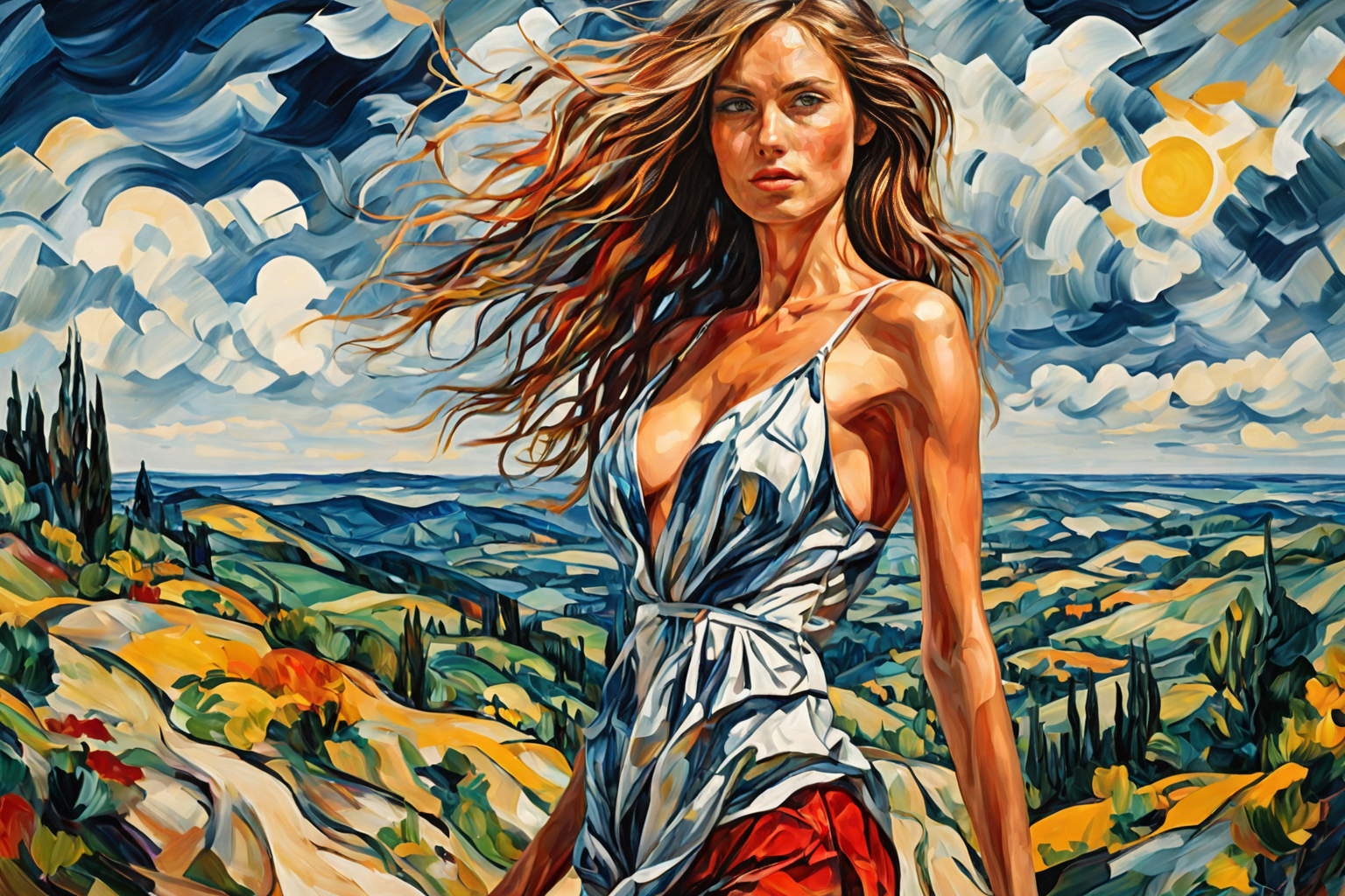 young woman, beautiful face, great body, gorgeous figure, long legs, pretty eyes, long hair, great bust, beautiful background, magnificent scenery, Maurice de Vlaminck style, HD, sharp focus, stunningly beautiful, Expressionism Art Style, movement, contrast, emotional, exaggerated forms, expressionism art style