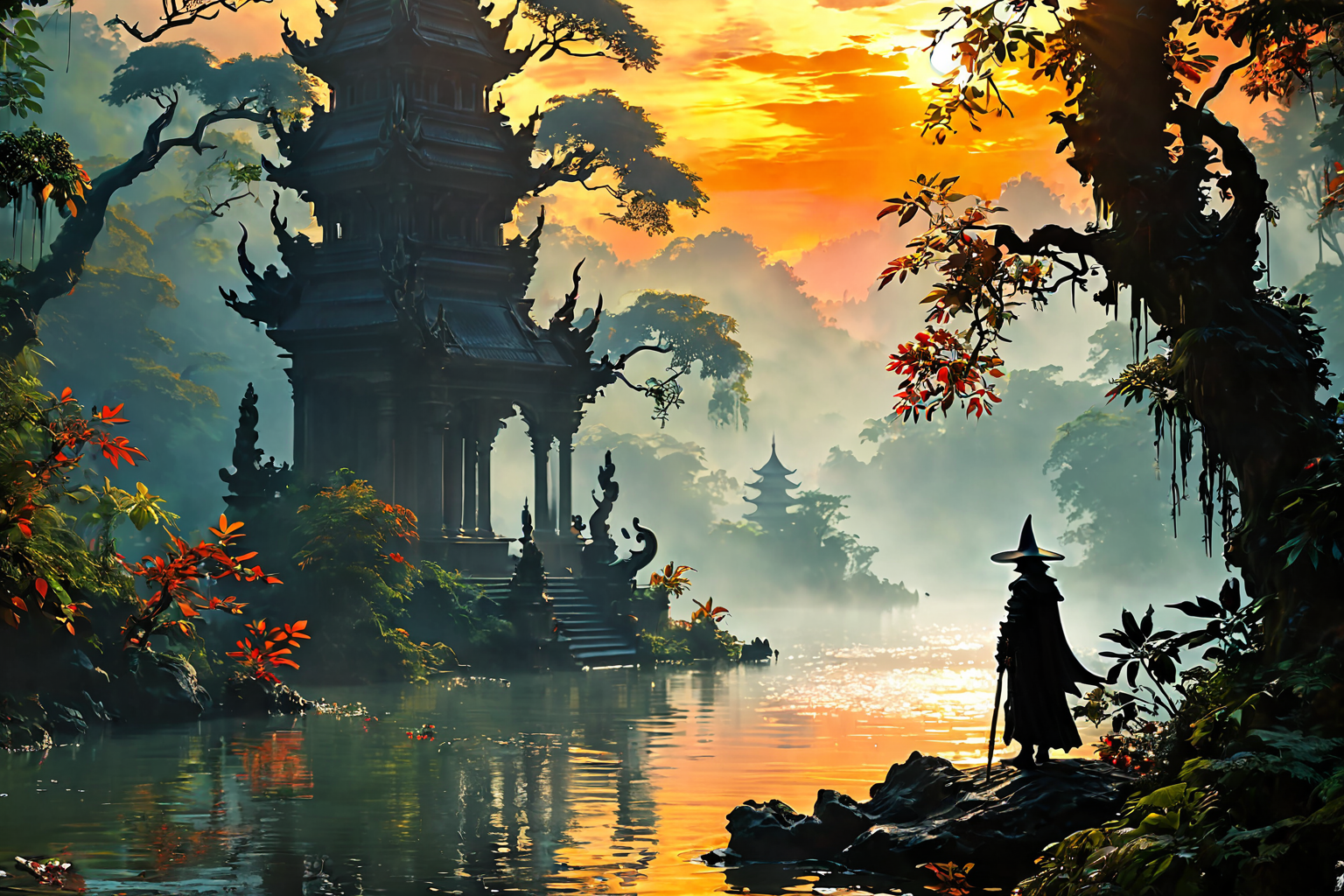 Create a Gothic collage painting set in futuristic Malaysia during sunrise. The scene depicts a dense, tropical forest bathed in the warm glow of early morning light. Towering trees with intricate, gnarled branches reach towards the sky, their leaves shimmering with a faint, ethereal light. At the forest’s edge, a lone, cloaked figure stands, their silhouette resembling a witch, gazing out over a misty, shimmering lake. The overall atmosphere is both serene and unsettling, evoking a sense of mystical tranquility amidst the lush, otherworldly landscape. Follow the artistic style of Peter Paul Rubens, emphasizing rich colors, dynamic brushstrokes, and detailed textures.