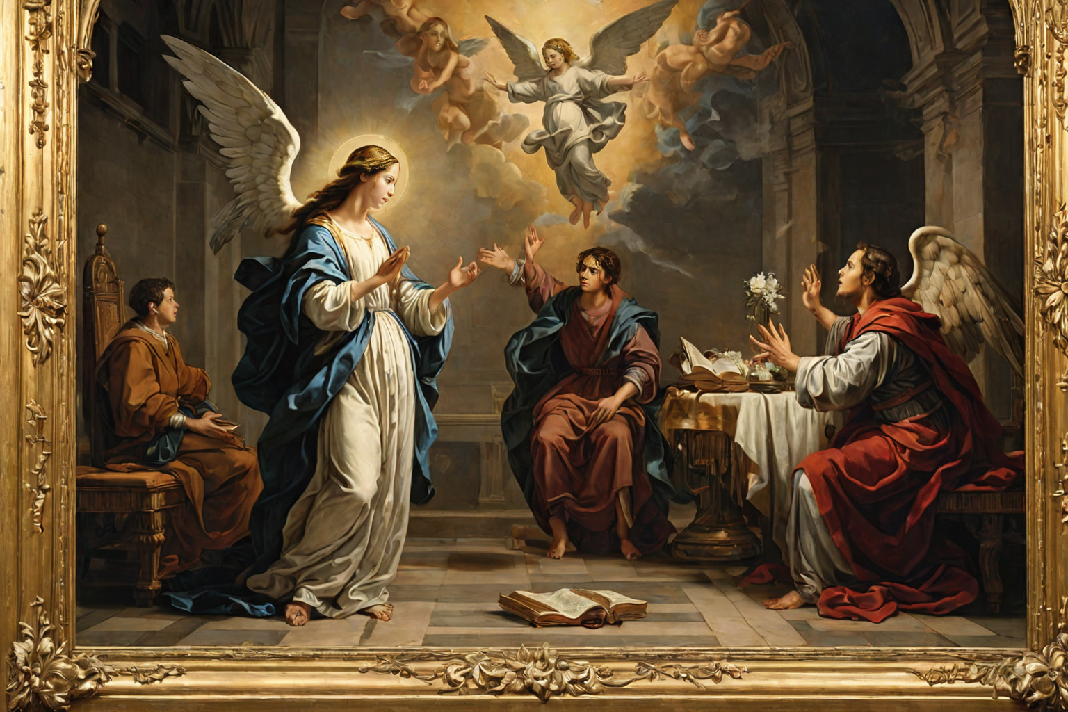 The Annunciation by Bartolomé Esteban Murillo , Baroque painting, angel Gabriel, Virgin Mary, Jesus, Spanish Baroque artist, religious works, Murillo, spiritual, emotional, scene HD, sharp focus, stunningly beautiful, flat papercut style, silhouette, clean cuts, paper, sharp edges, minimalist, color block