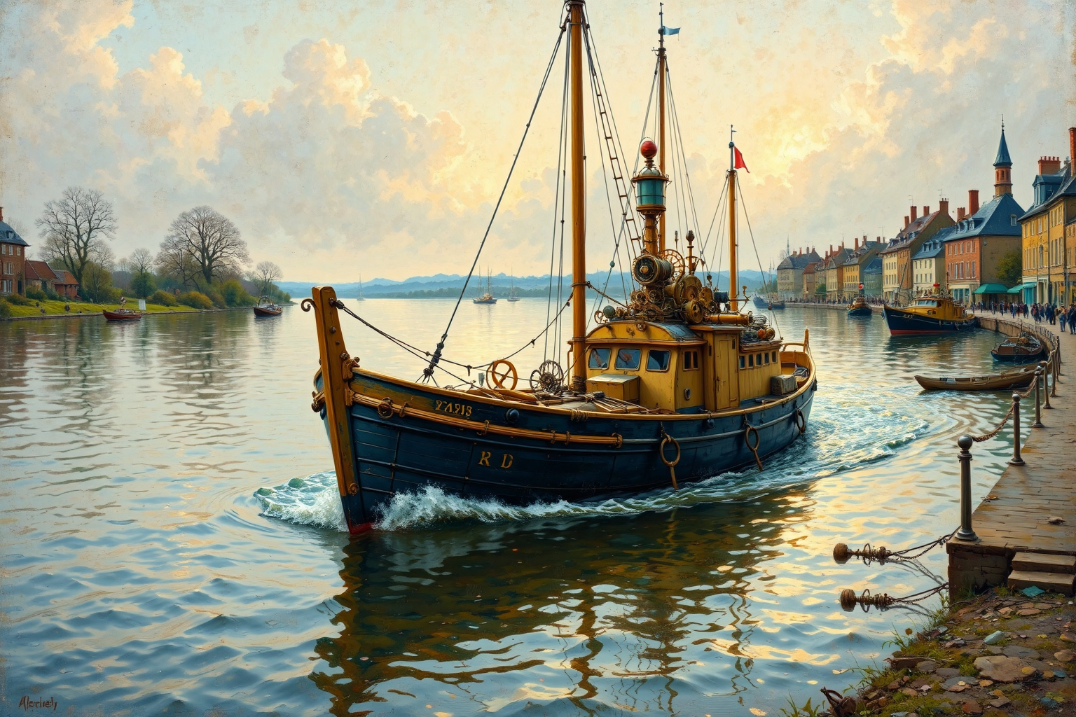 NSFW, Boat in the Flood at Port Marly by Alfred Sisley , Alfred Sisley, Impressionism, oil-on-canvas, boat, flood, Port Marly, France, tranquil, landscape, river, light, weather HD, sharp focus, stunningly beautiful, steampunk style, antique, mechanical, brass and copper tones, gears, intricate, detailed