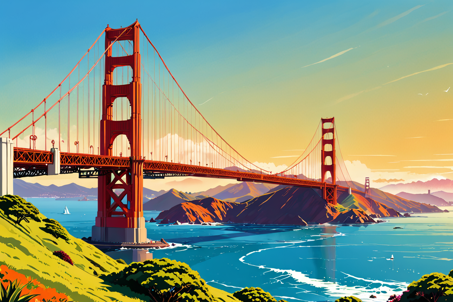 Golden Gate National Recreation Area San Francisco, Elena Elagina style, Golden Gate National Recreation Area, San Francisco, natural beauty, historical significance, park, hiking trails, pristine landscape, nature lovers, history buffs, breathtaking views, Golden Gate Bridge HD, sharp focus, stunningly beautiful, Googie Art Style, dynamic, dramatic, 1950’s futurism, bold boomerang angles, Googie art style