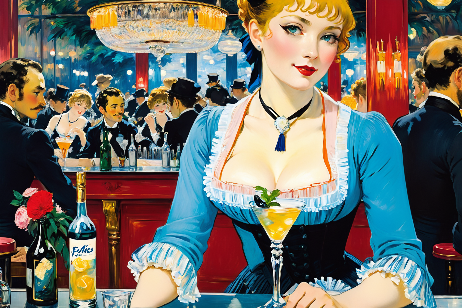 PromptA Bar at the Folies-Bergère by Édouard Manet , Edouard Manet, Folies-Bergère, Parisian café-concert establishment, unconventional composition, innovative use of color, female bartender, viewer, daringly modern HD, sharp focus, stunningly beautiful, manga style, vibrant, high-energy, detailed, iconic, Japanese comic style