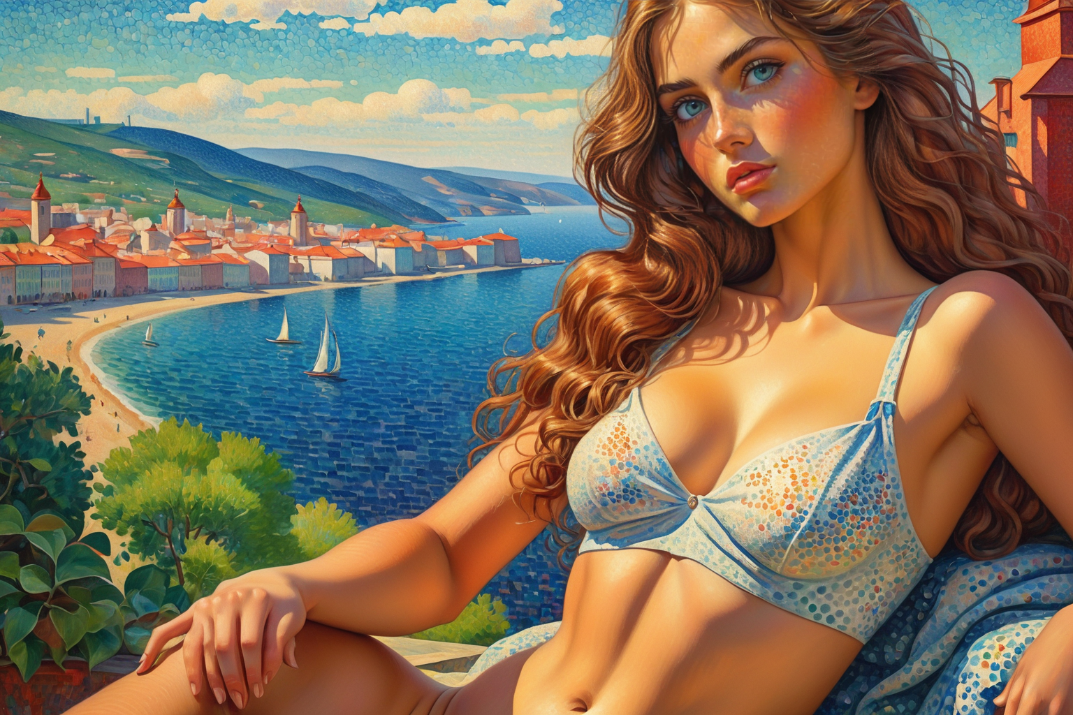 young woman, beautiful face, great body, gorgeous figure, long legs, pretty eyes, long hair, great bust, beautiful background, magnificent scenery, Kuzma Petrov-Vodkin style, HD, sharp focus, stunningly beautiful, Neo-Impressionism, tiny dabs of color, Pointillism, painterly, Neo-Impressionism