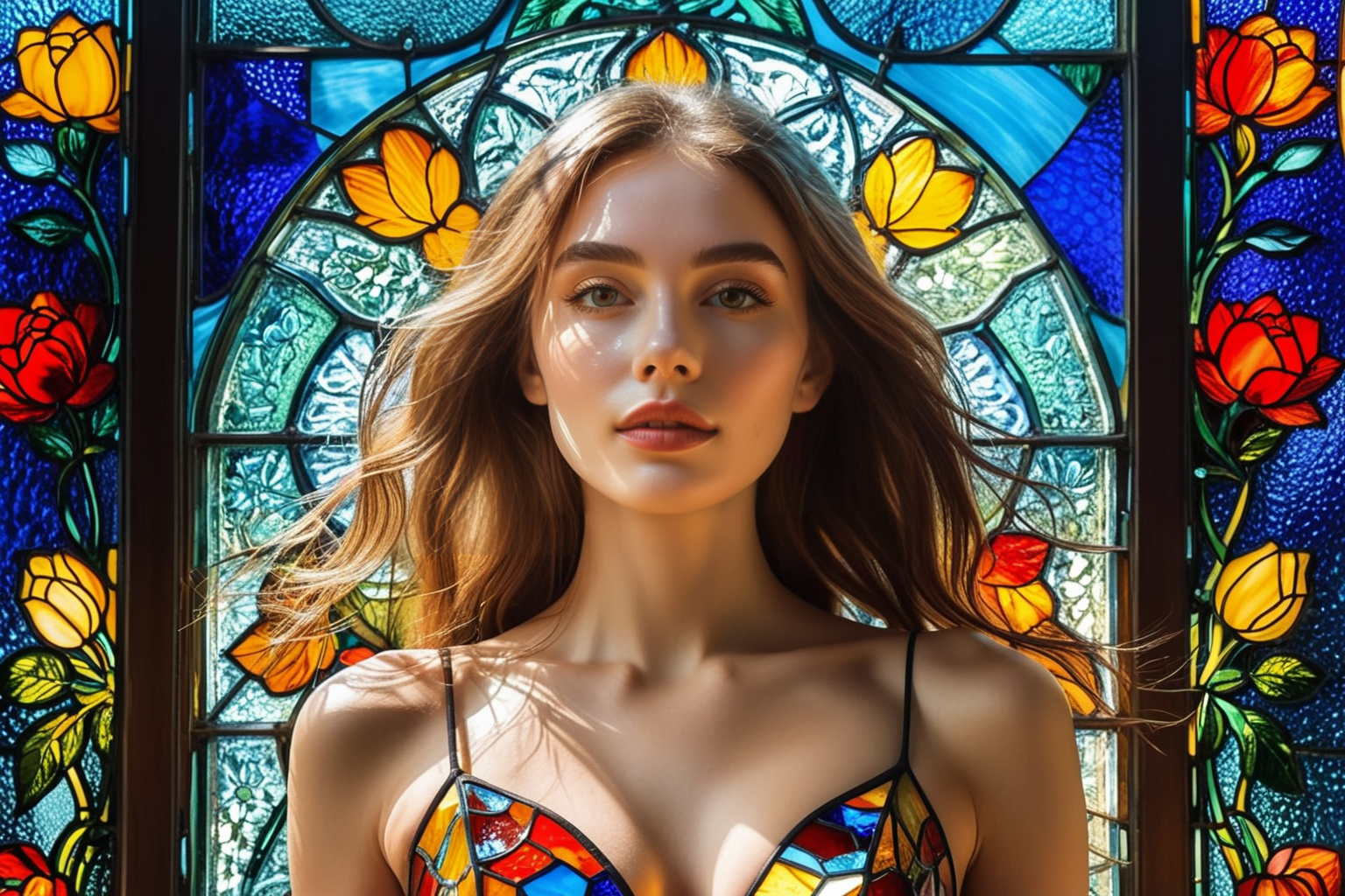 young woman, beautiful face, great body, gorgeous figure, long legs, pretty eyes, long hair, great bust, beautiful background, magnificent scenery, Andy Warhol style, HD, sharp focus, stunningly beautiful, stained glass style, vibrant, beautiful, translucent, intricate, detailed