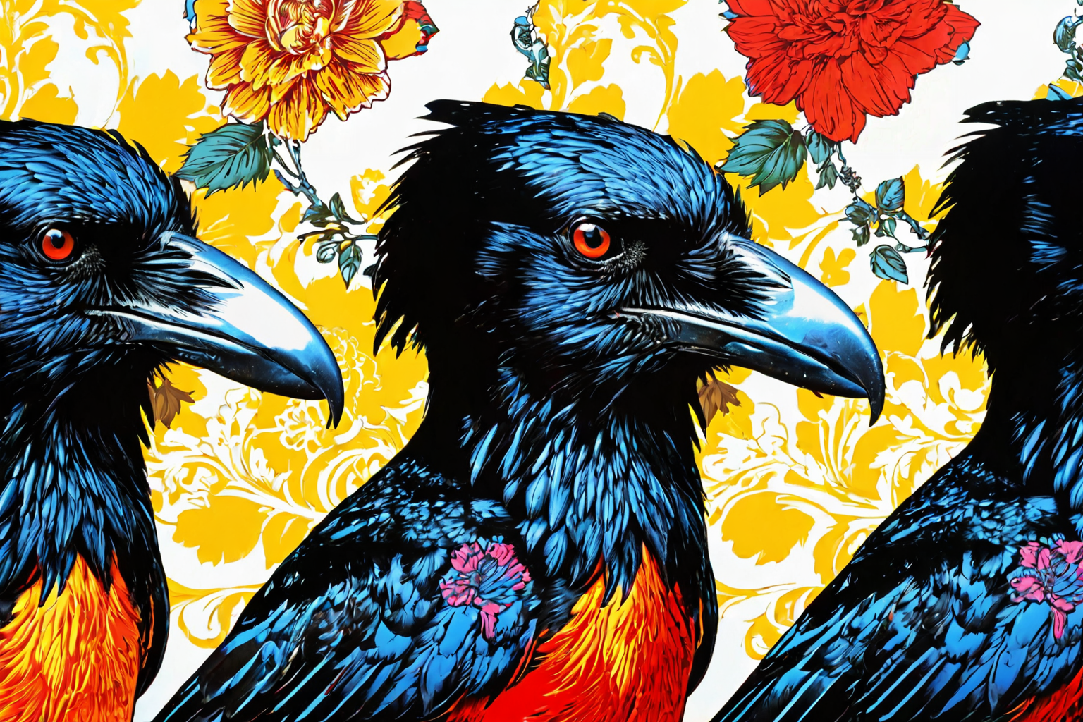 Crow, Andy Warhol style, HD, sharp focus, stunningly beautiful, Ornate and Intricate, decorative, highly detailed, elaborate, ornate, intricate