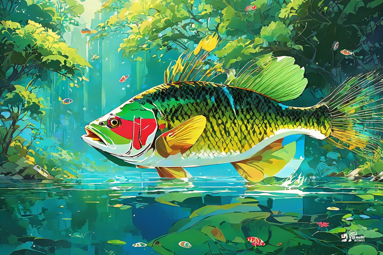 Peacock Bass, Mikhail Larionov style, HD, sharp focus, stunningly beautiful, anime artwork, anime style, key visual, vibrant, studio anime, highly detailed