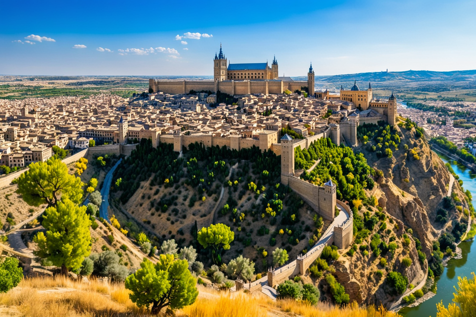 View of Toledo by El Greco , El Greco, View of Toledo, Alcázar fortress, Spanish city, Toledo skyline, perspective, dramatic lighting, architectural details, religious buildings, 1589. HD, sharp focus, stunningly beautiful, Pokémon style, vibrant, cute, anime, fantasy, reminiscent of Pokémon series