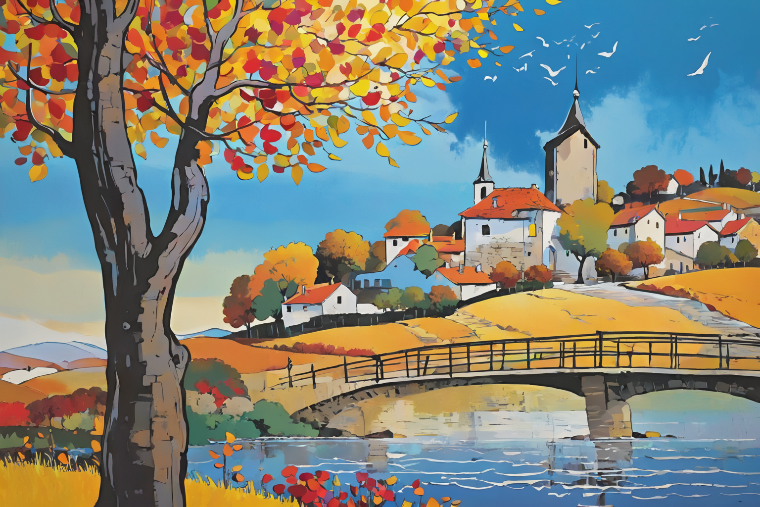 Braque style, dreamy landscape, autumn breeze, sunset glow, horizon, quaint village, traditional homes, vibrant people, daily lives, nature, romantic scene, effortless bridging, Braque’s Scribble Art technique, Romanticism, contemporary expression, onlookers, solace, surroundings, timeless scene, wonders of nature, harmonious gathering, colorful flowers, beech tree, curious bird, graceful female figure, ethereal atmosphere HD, sharp focus, stunningly beautiful, Pop Art, vivid colors, flat color, 2D, strong lines, Pop Art