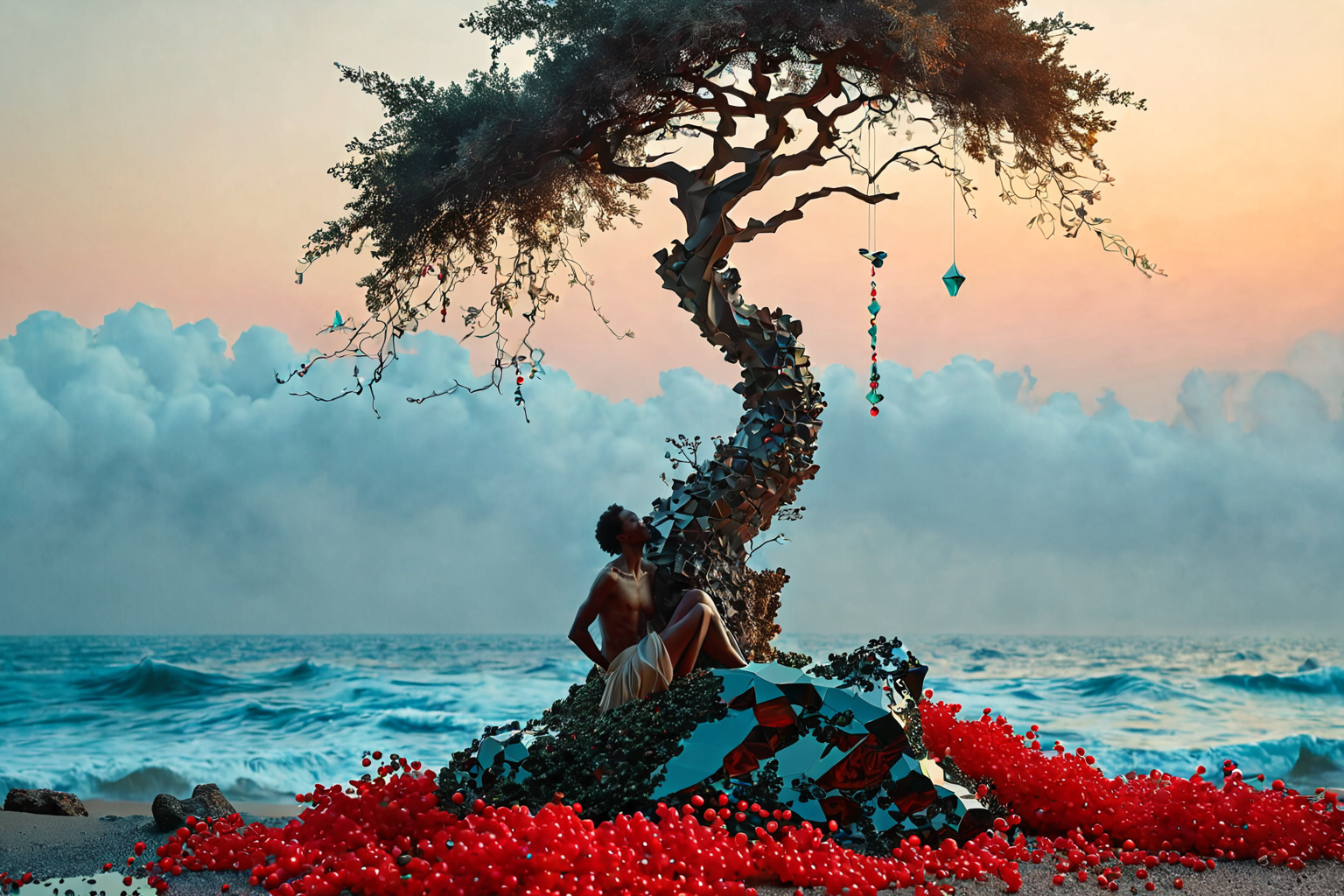 A surreal scene unfolds in Eritrea’s Red Sea coastal city, Asmara, at dawn on a hazy, misty day in 2154. A Dasiphora fruticosa tree stands tall, its gnarled branches tangled with glowing, iridescent glass beads that refract the cloudy light. The air is thick with the scent of frankincense and myrrh as a parade of levitating, biomorphic creatures, reminiscent of Dalí’s dreamscapes, drift by, leaving trails of shimmering, crystalline sparks. In the background, the skeletal remains of a futuristic skyscraper rise like a fossilized monument to humanity’s fleeting endeavors. The style is Dadaist-inspired glass painting, as if Ilya Repin’s avant-garde visions had taken on a life of their own.