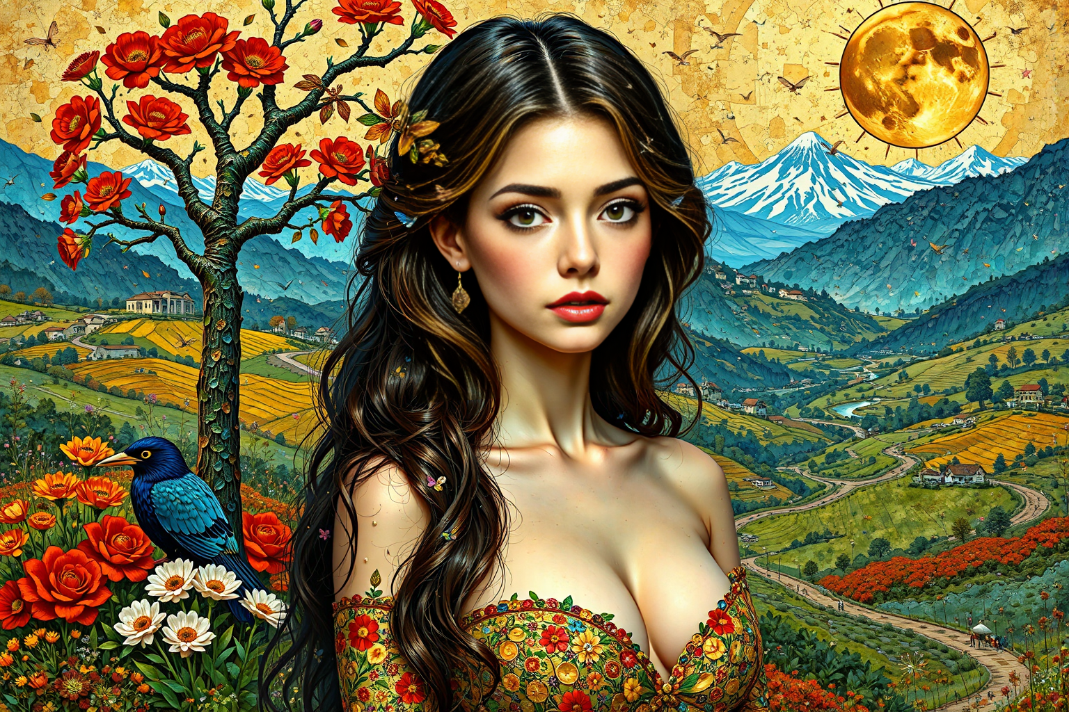 young woman, beautiful face, great body, gorgeous figure, long legs, pretty eyes, long hair, great bust, beautiful background, magnificent scenery, Gustav Klimt style, HD, sharp focus, stunningly beautiful, papercut collage of, mixed media, textured paper, overlapping, asymmetrical, abstract, vibrant