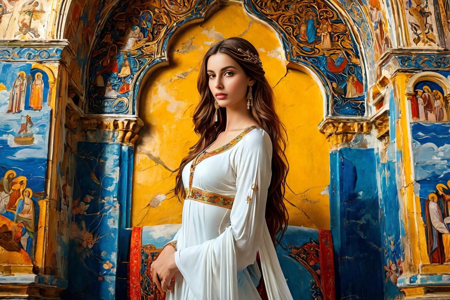 NSFW, young woman, beautiful face, great body, gorgeous figure, long legs, pretty eyes, long hair, great bust, beautiful background, magnificent scenery, Arshile Gorky style, HD, sharp focus, stunningly beautiful, Neo-Byzantine, grand decorative religious style, Orthodox Christian inspired, Neo-Byzantine