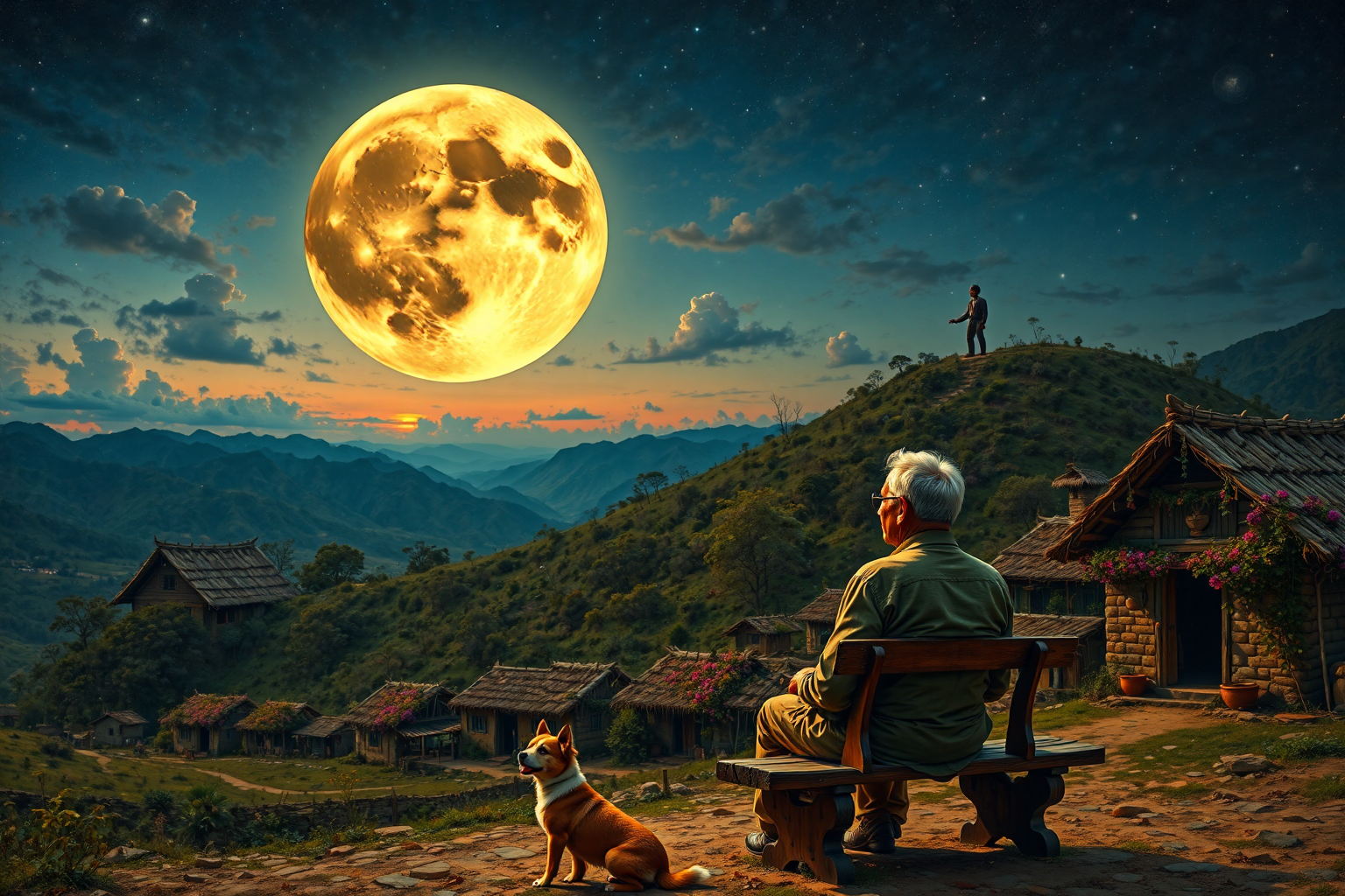 Create an evocative collage painting in the style of Gustave Courbet’s Sentimentalism, depicting a peaceful Bolivian village during a lunar eclipse. As evening falls, the sky darkens, casting an ethereal glow over the landscape. In the foreground, an elderly couple sits on a wooden bench, gazing up at the celestial spectacle, their weathered faces illuminated by the moon’s soft light. A small, scruffy dog lies at their feet, its eyes fixed on the same enchanting sight. The village, nestled among verdant mountains, is adorned with traditional thatched-roof homes and vibrant hanging plants, their colors contrasting against the darkening sky. In the distance, a lone figure stands on a ridge, arms outstretched, as if embracing the universe. The scene captures a moment of quiet contemplation, where nature’s grandeur intertwines with human emotion.