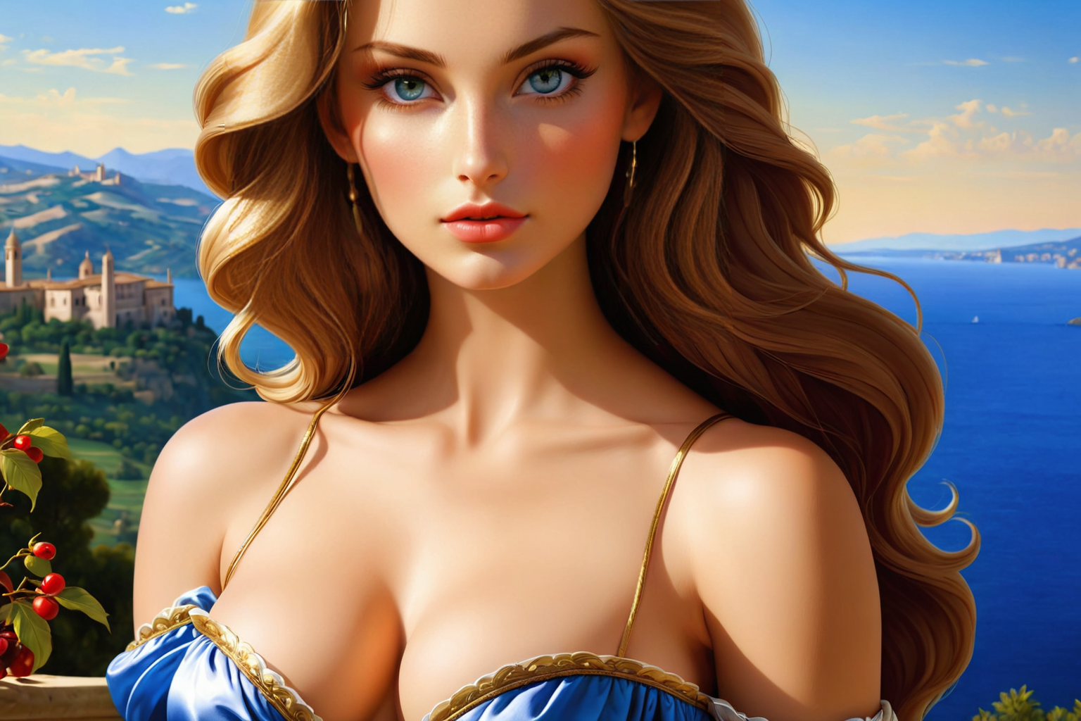 young woman, beautiful face, great body, gorgeous figure, long legs, pretty eyes, long hair, great bust, beautiful background, magnificent scenery, Agnolo Bronzino style, HD, sharp focus, stunningly beautiful, Silhouette Art, high contrast, well defined, Silhouette Art