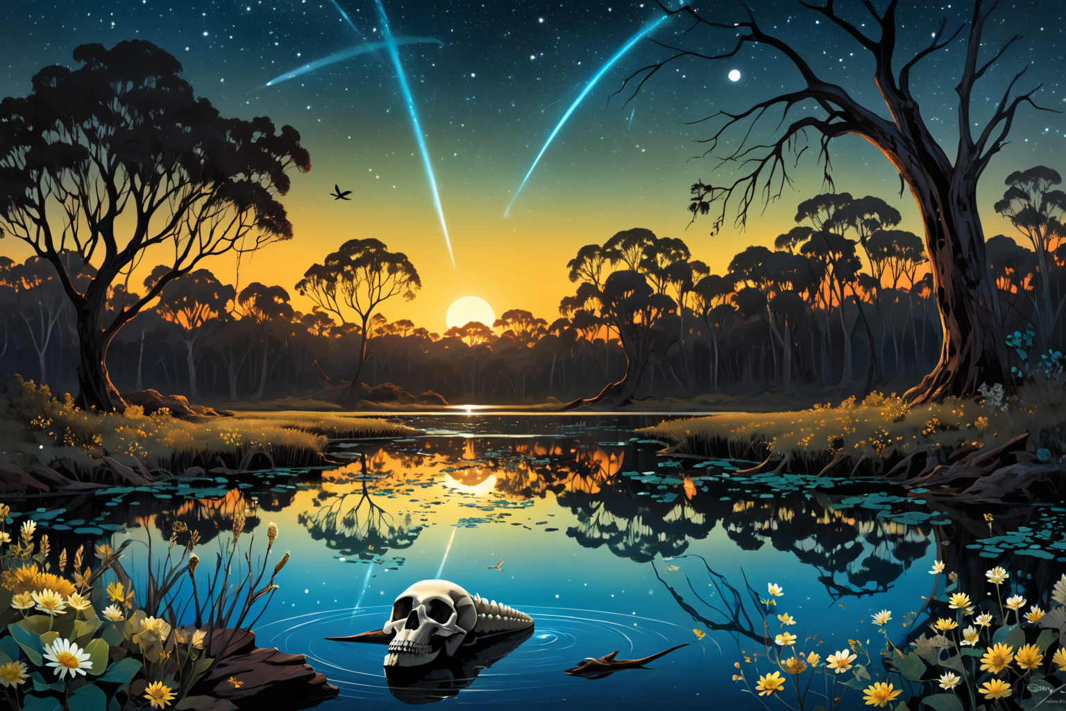 In the midground, a still pond reflects the celestial dance above, its surface undisturbed save for the play of luminescent plankton. The water’s edge is lined with iridescent dragonflies, their delicate wings catching the moon’s soft glow.