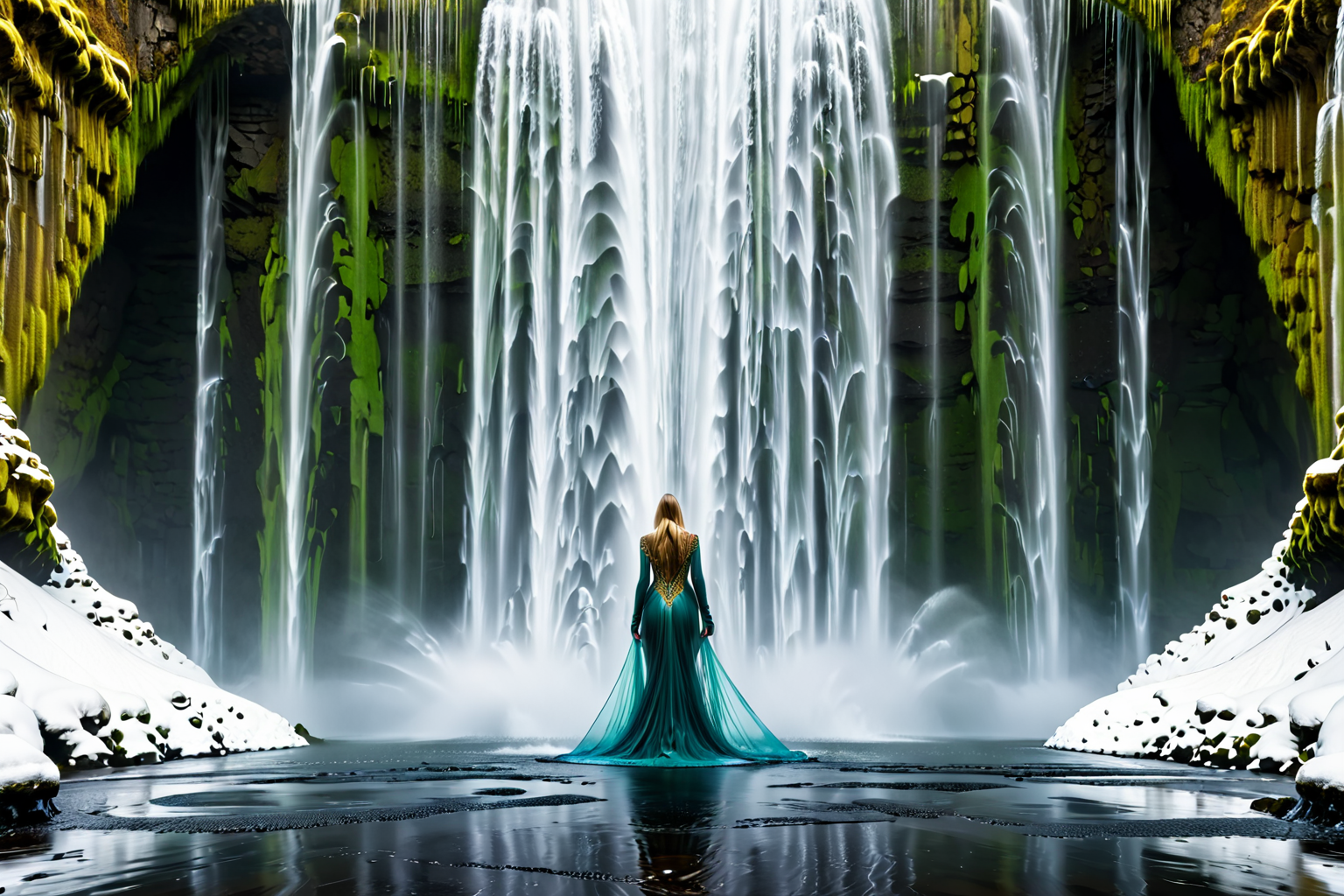 Seljalandsfoss Waterfall Iceland, Dmitri Gutov style, Iceland, Seljalandsfoss Waterfall, force, beauty, natural wonder, misty veil, atmosphere, ethereal, awe, gratitude, experience. HD, sharp focus, stunningly beautiful, Art Deco style, geometric shapes, bold colors, luxurious, elegant, decorative, symmetrical, ornate, detailed