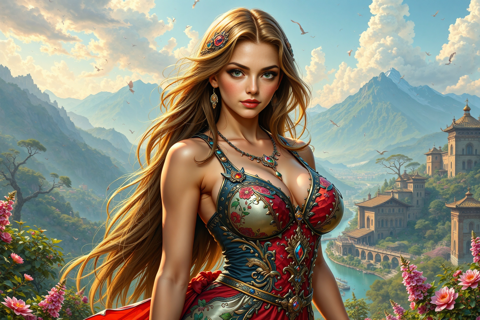 young woman, beautiful face, great body, gorgeous figure, long legs, pretty eyes, long hair, great bust, beautiful background, magnificent scenery, Alphonse Mucha style, HD, sharp focus, stunningly beautiful, fighting game style, dynamic, vibrant, action-packed, detailed character design, reminiscent of fighting video games
