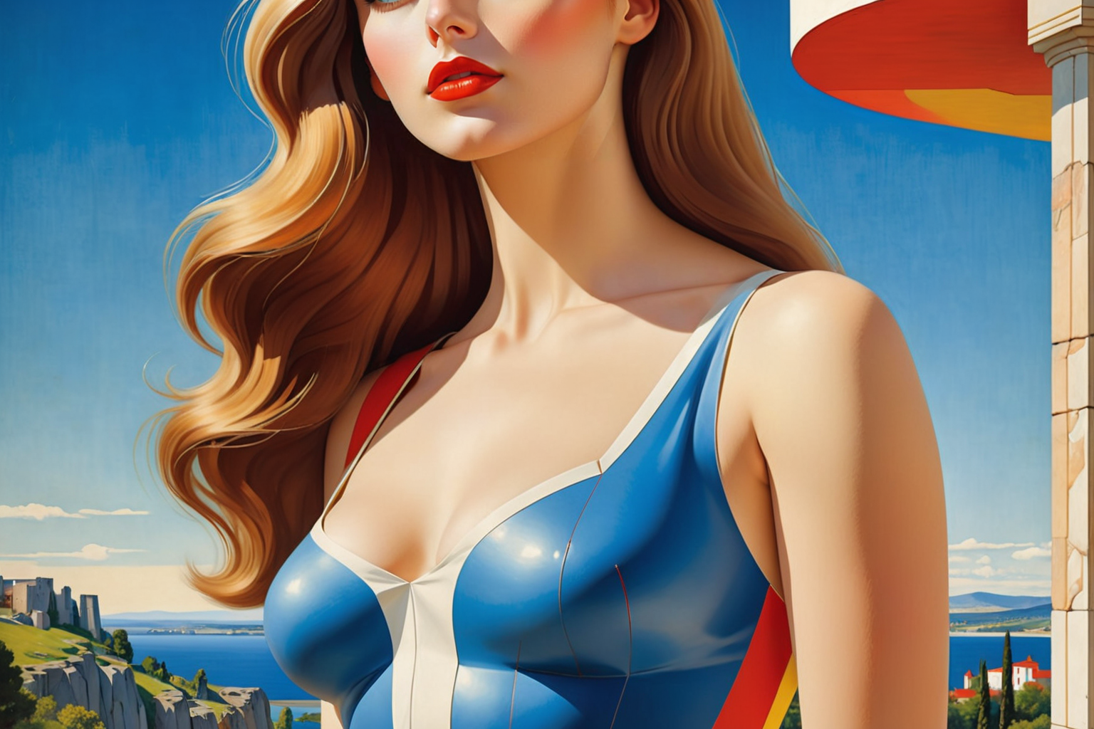 young woman, beautiful face, great body, gorgeous figure, long legs, pretty eyes, long hair, great bust, beautiful background, magnificent scenery, Arnold Böcklin style, HD, sharp focus, stunningly beautiful, Bauhaus-Style Poster, simple geometric shapes, clean lines, primary colors, Bauhaus-Style Poster