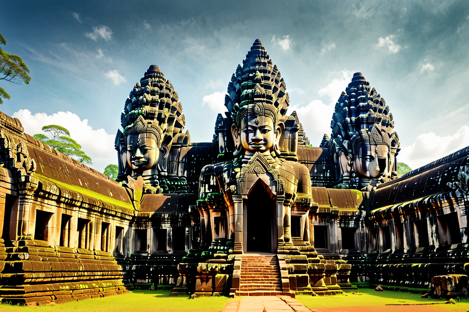Angkor Thom Cambodia, Grisha Bruskin style, Angkor Thom, Cambodia, magnificent architecture, historical significance, awe-inspiring, ancient temples, mesmerizing, beauty, fascinating stories HD, sharp focus, stunningly beautiful, grunge style, textured, distressed, vintage, edgy, punk rock vibe, dirty, noisy
