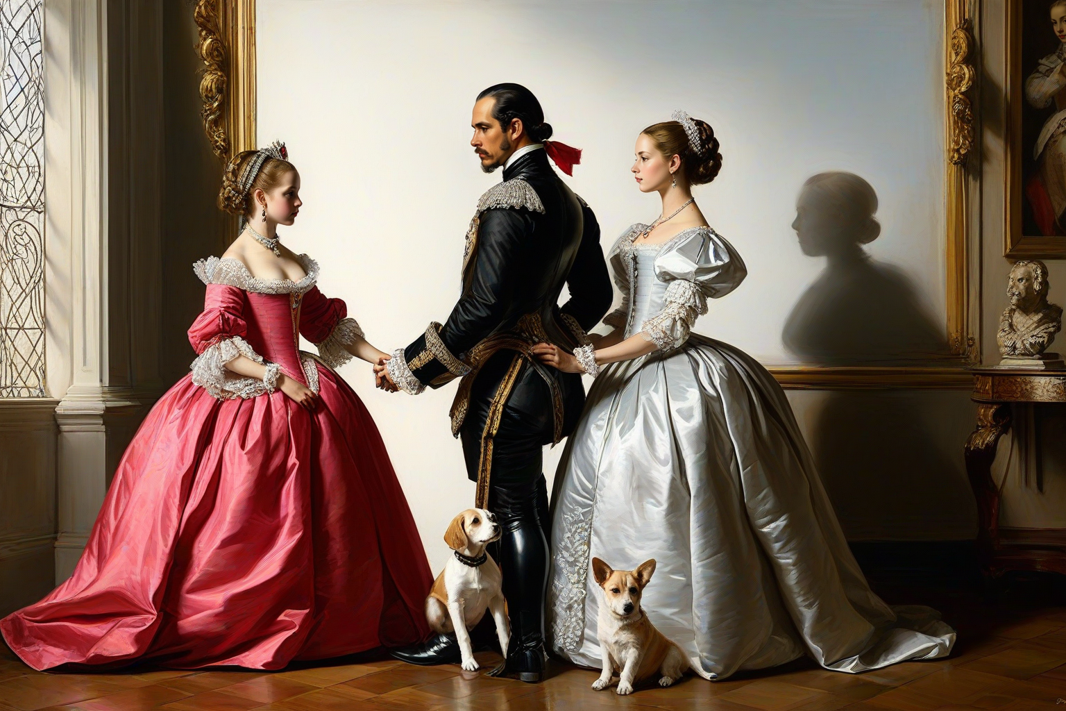 King Philip’s Family by Diego Rodriguez de Silva y Velazquez , Diego Velazquez, King Philip’s Family, painting, Spanish royal family, Infanta Margarita, dog, gentleman, courtier, relaxed moment, informal scene, young girl, playfully interacting, self-portrait, famous, identified, Velázquez himself HD, sharp focus, stunningly beautiful, Silhouette Art, high contrast, well defined, Silhouette Art
