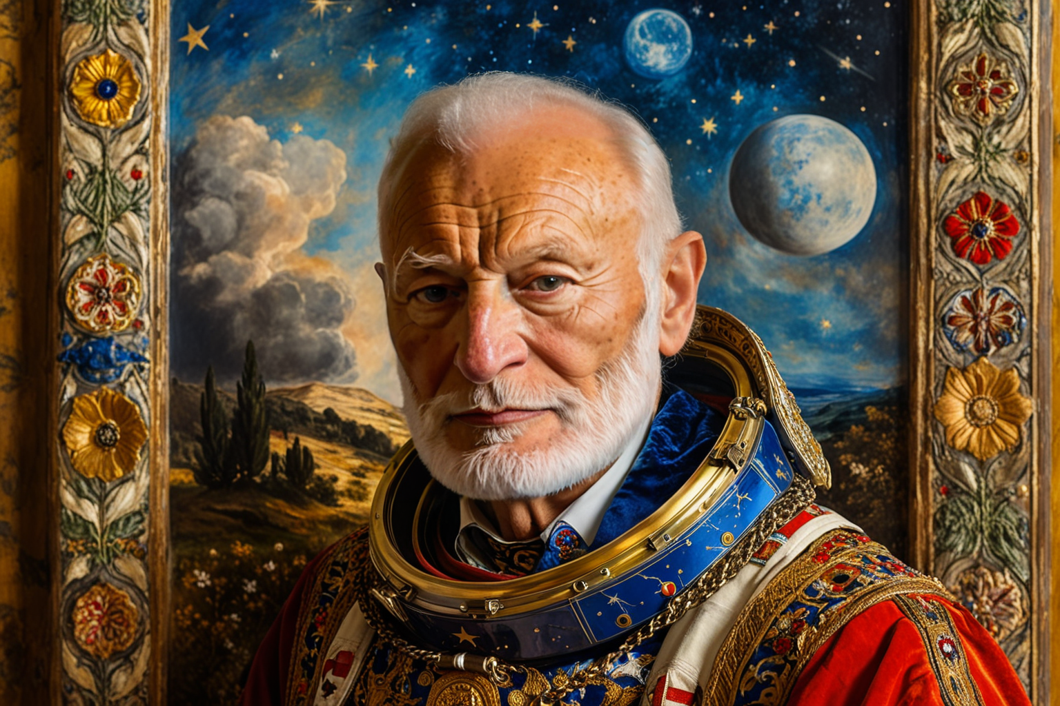PromptBuzz Aldrin, portrait, Sir John Everett Millais style, HD, sharp focus, stunningly beautiful, Neo-Byzantine, grand decorative religious style, Orthodox Christian inspired, Neo-Byzantine