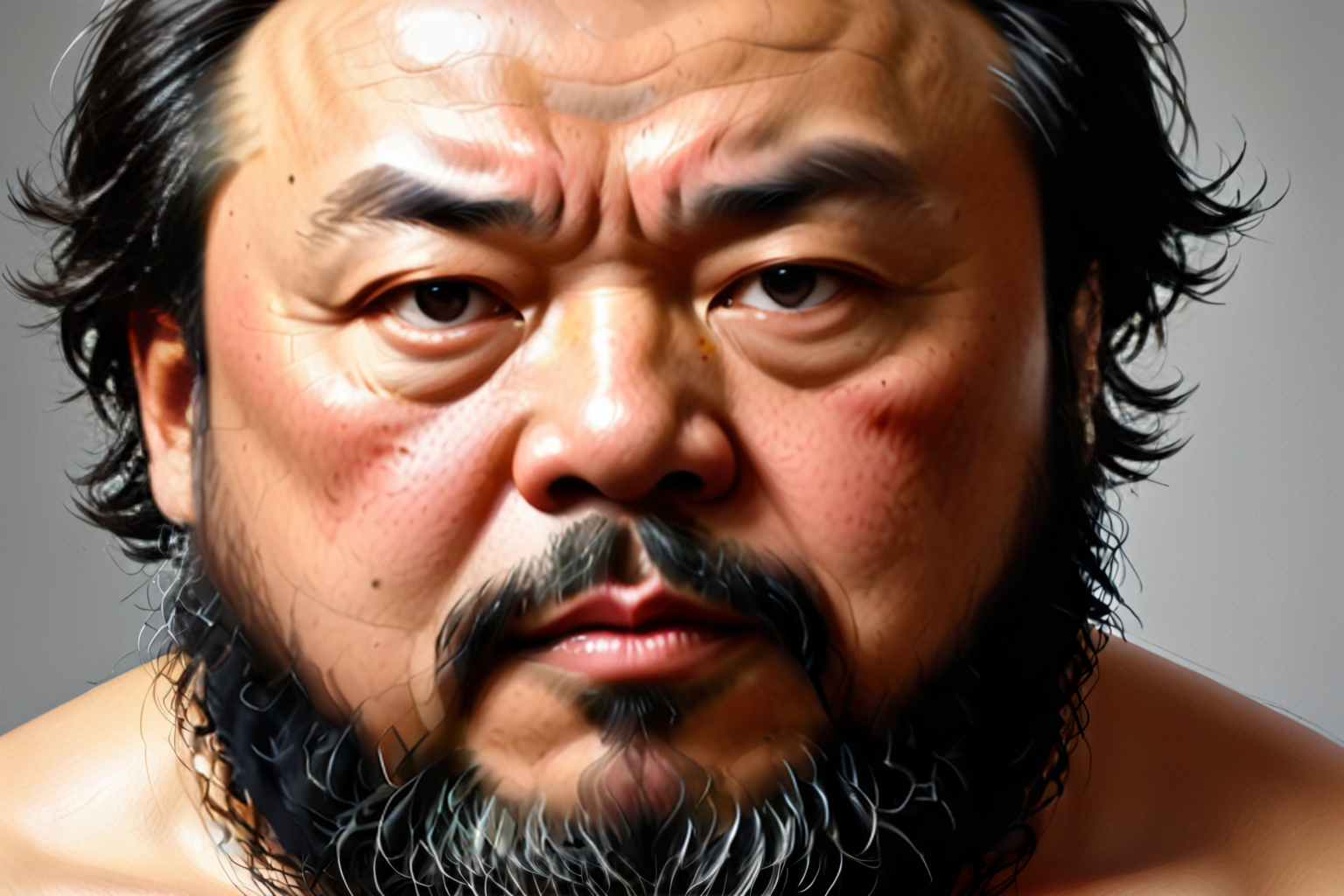 nude, NSFW, Ai Weiwei, portrait, Vasily Perov style, HD, sharp focus, stunningly beautiful, Caricature, exaggerated, comical, caricature