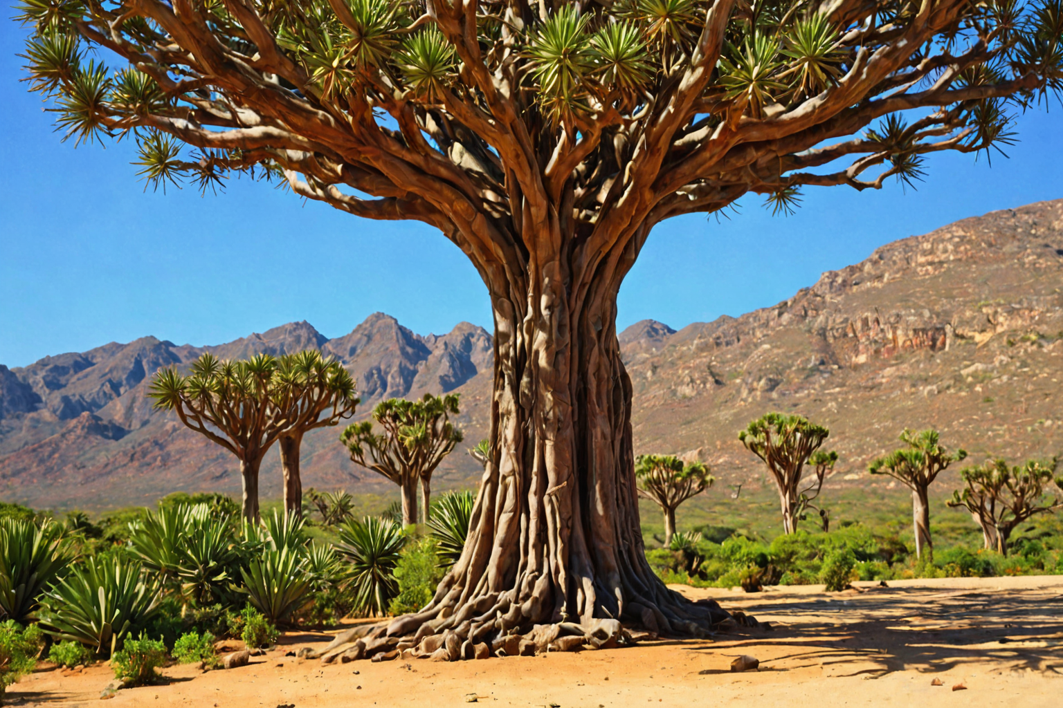 Socotra Yemen, Willem de Kooning style, Socotra, Yemen, flora, fauna, Dragon’s Blood tree, unique, symbol, landscape, locals, unforgettable experience. HD, sharp focus, stunningly beautiful, Neo-Rococo, curved forms, naturalistic ornamentation, elaborate, decorative, gaudy, Neo-Rococo