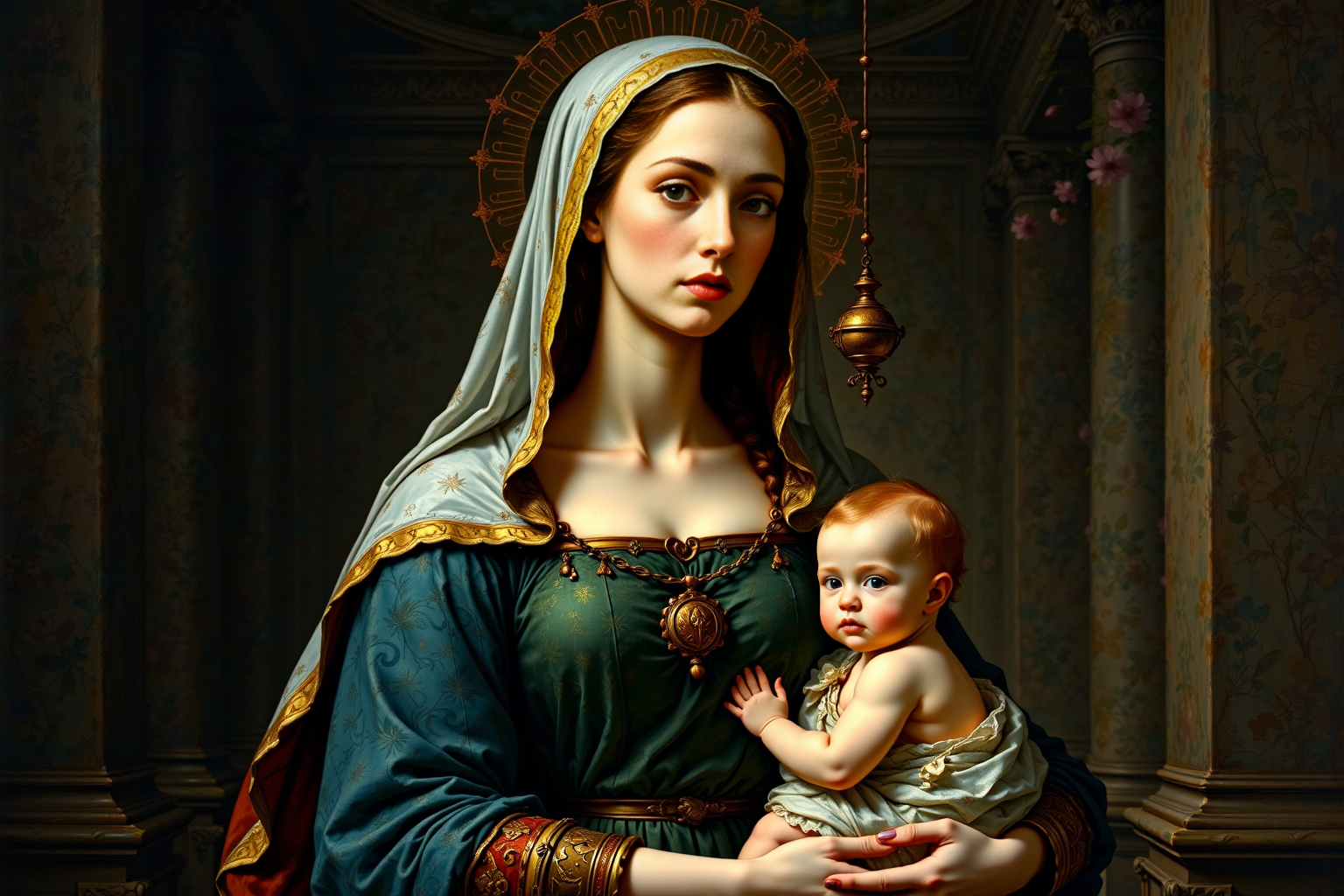 The Madonna with the Long Neck by Parmigianino , Renaissance painting, Parmigianino, Madonna with long neck, unique composition, intricate details, Mary holding Christ Child, elongated neck, human anatomy, perspective, National Gallery, London. HD, sharp focus, stunningly beautiful, Tranquil Relaxing Atmosphere, calming style, soothing colors, peaceful, idealic, Tranquil Relaxing Atmosphere