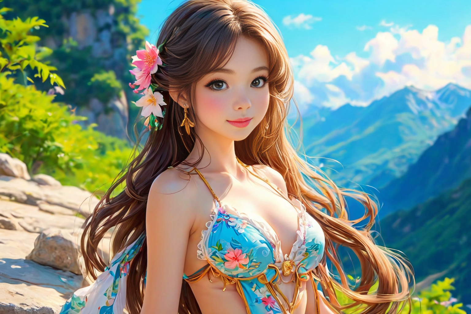 nude, NSFW, young woman, beautiful face, great body, gorgeous figure, long legs, pretty eyes, long hair, great bust, beautiful background, magnificent scenery, Nicholas Roerich style, HD, sharp focus, stunningly beautiful, Adorable Kawaii, pretty, cute, adorable, kawaii