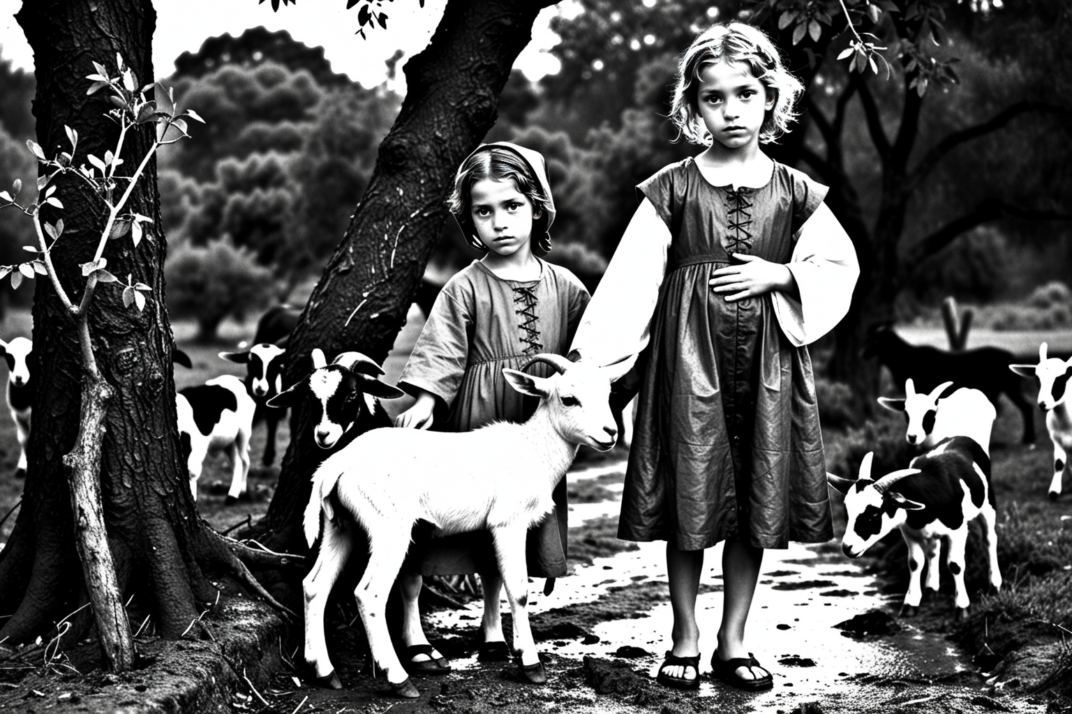Rembrandt style, village, storm, sunset, rain, children, goats, olive trees, birds, Rubus bushes, oil painting, texture, depth, realism, contrast, wet ground, peace, turmoil, war, adverseriality, nature, humanity HD, sharp focus, stunningly beautiful, daguerreotype photo, 1920s photography, historical photo, aged photo, black & white photography, damaged photo