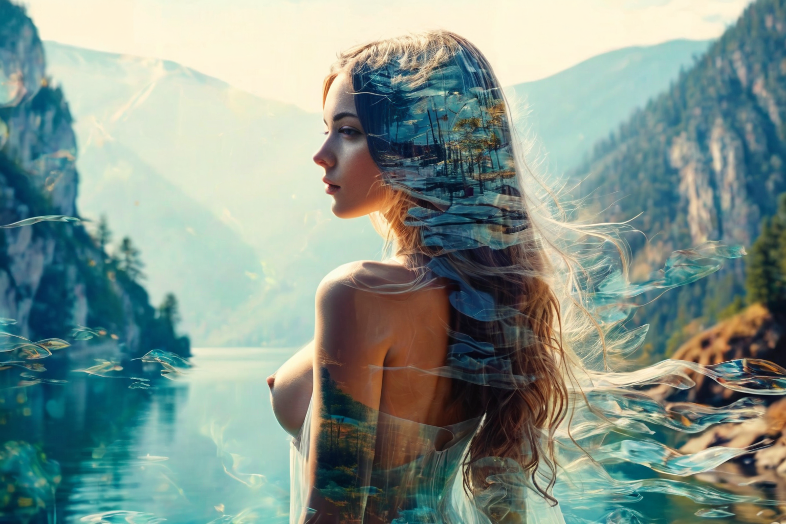 nude, NSFW, young woman, beautiful face, great body, gorgeous figure, long legs, pretty eyes, long hair, great bust, beautiful background, magnificent scenery, Henryk Siemiradzki style, HD, sharp focus, stunningly beautiful, Double Exposure Style, double image ghost effect, image combination, double exposure style