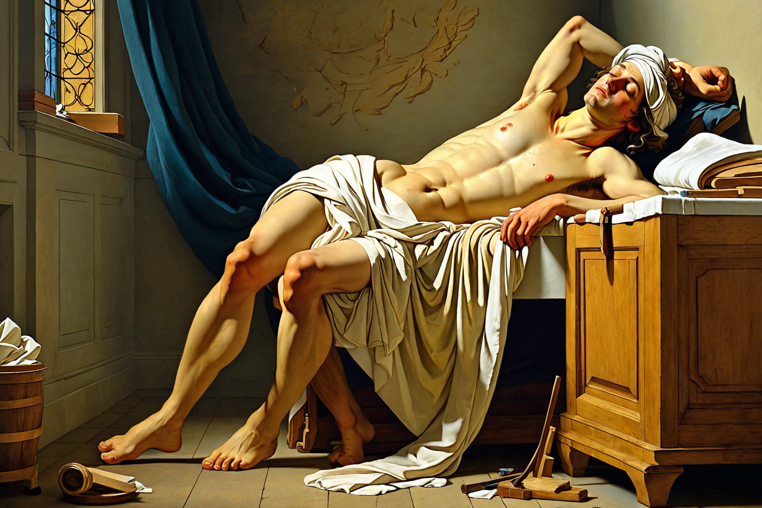 Death of Marat by Jacques-Louis David , Jacques-Louis David, famous painting, Death of Marat, Jean-Paul Marat, French Revolution, leading figure, assassination, Charlotte Corday, account, bath, important works of art, French Revolution era, scene. HD, sharp focus, stunningly beautiful, impressionist painting, loose brushwork, vibrant color, light and shadow play, captures feeling over form
