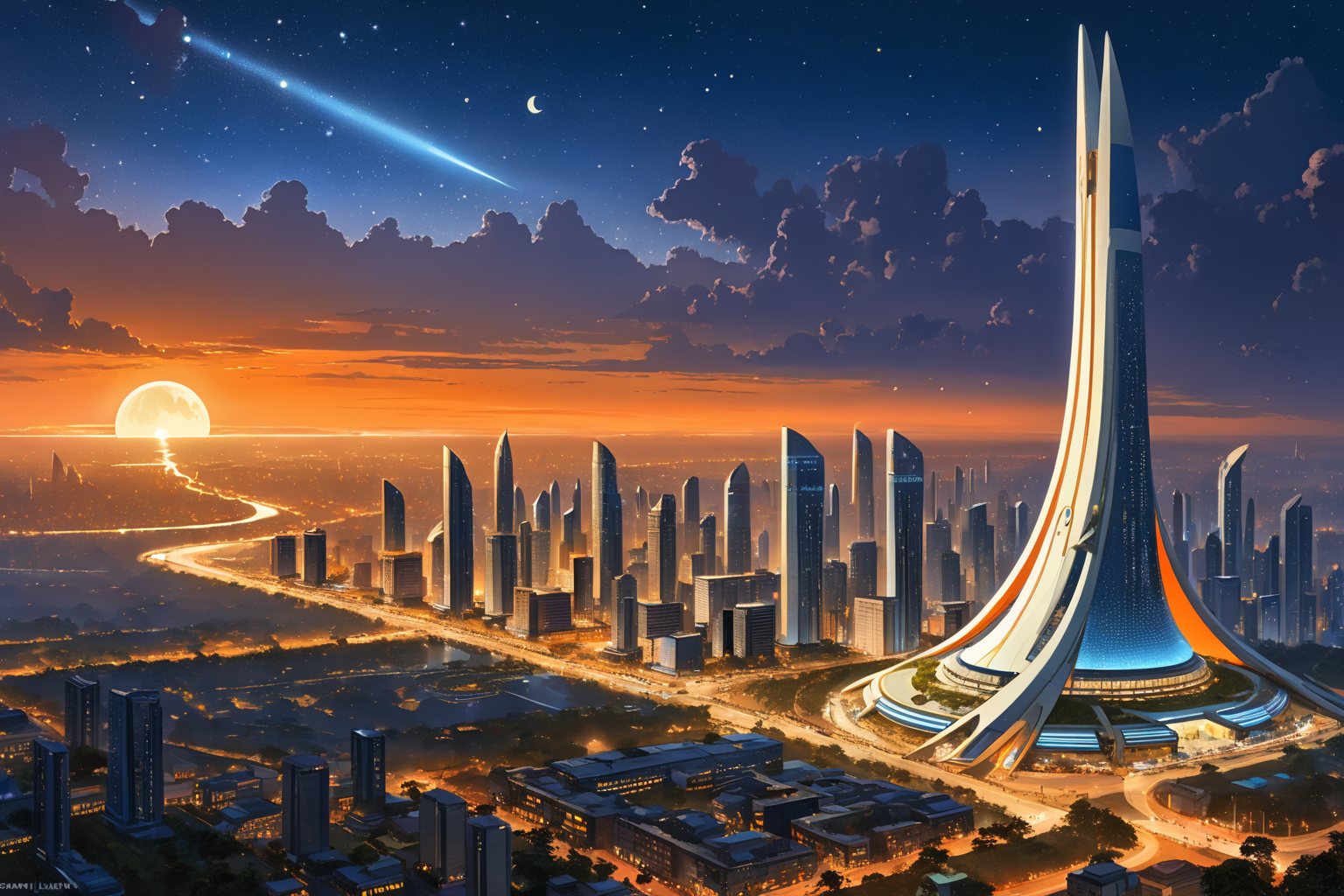 Isaac Levitan style, futuristic city, Republic of Congo, dawn, lunar eclipse, advanced, natural landscape, young woman, determination, self-discovery, Nib garments, technologically enhanced, ginkgo tree, past civilizations, moonlight, orange hues, rising sun, otherworldly glow, futuristic architecture, innovative technologies, animals, bustling metropolis, unity, harmony HD, sharp focus, stunningly beautiful, Googie Art Style, dynamic, dramatic, 1950’s futurism, bold boomerang angles, Googie art style