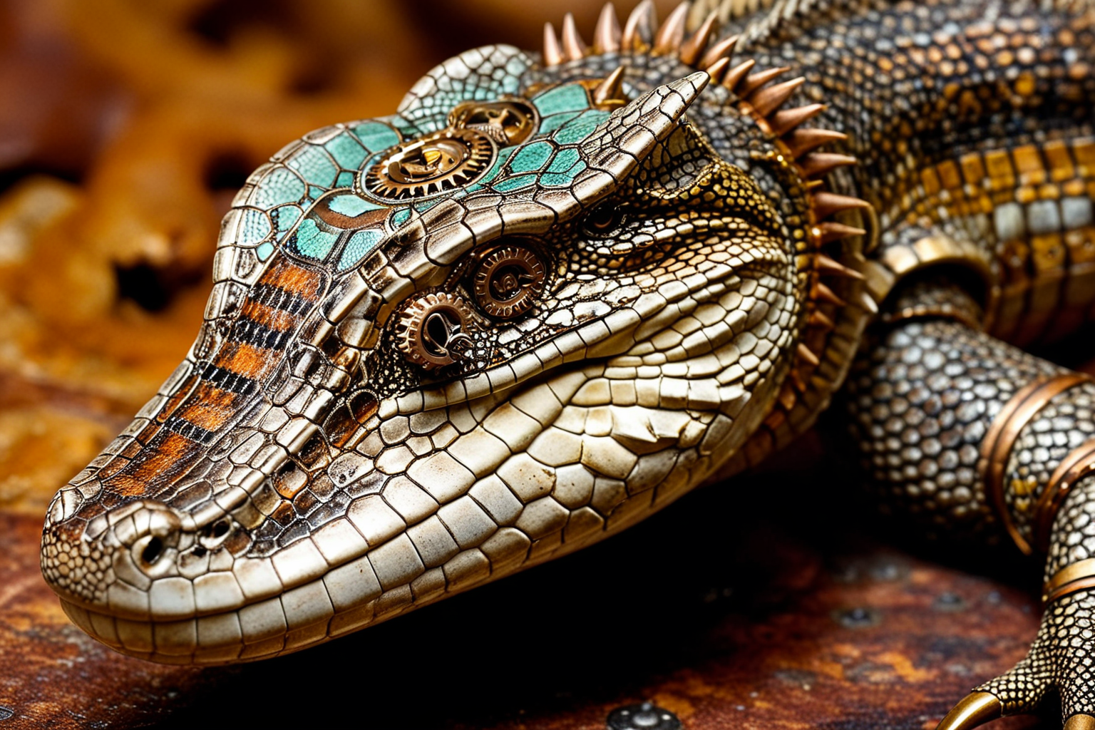 Northern Alligator Lizard, Franz Marc style, HD, sharp focus, stunningly beautiful, steampunk style, antique, mechanical, brass and copper tones, gears, intricate, detailed