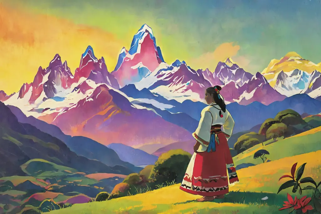 Create an evocative scene set in the early morning in Chile’s mountainous region, bathed in…